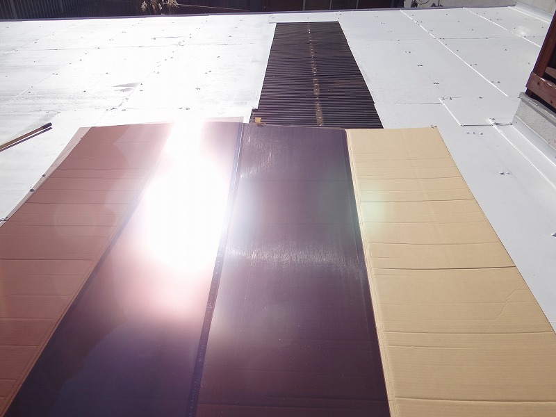 倉庫の屋根は錆止め塗布乾燥後、明り取りのポリカ材をはって、