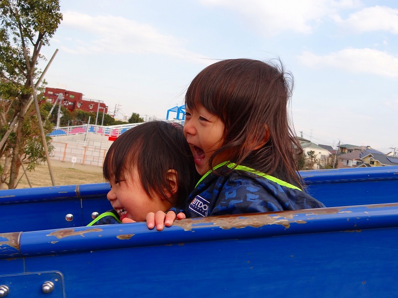 週末は実家へ帰っています。まずはチビ達のお気に入りの公園で、
