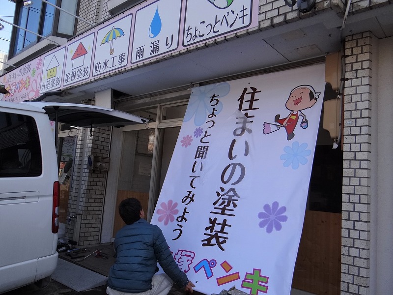 垂れ幕の設置完了ぅ。これで店先がちょっと明るくなりました。