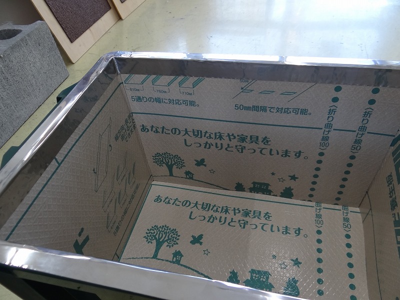 と、思いましたが、素材の耐久性を考え、今までの床養生材に戻します。当然、今回はこちらを表に。(あなたの大切な床や家具をしっかりと守っています。)使う用途は違うけど、ホット安心する一言ですね。