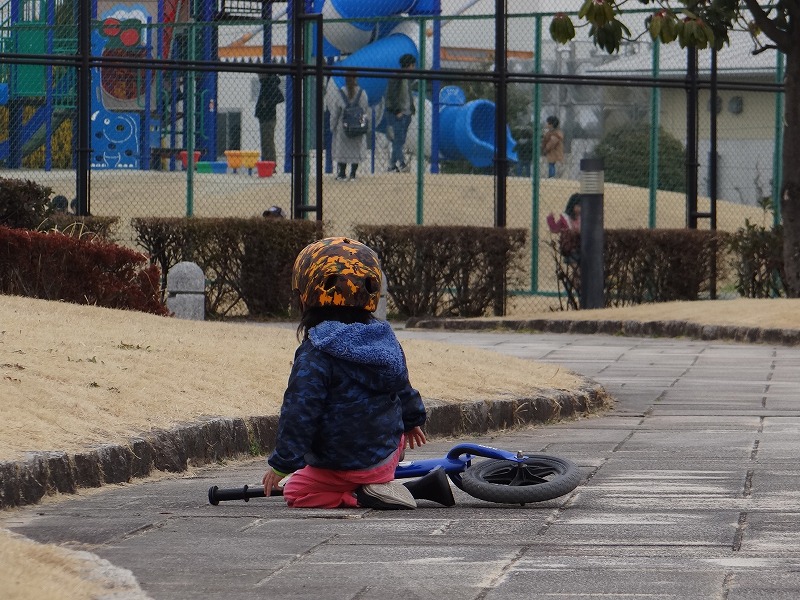 ストライダーでコケる次男を、