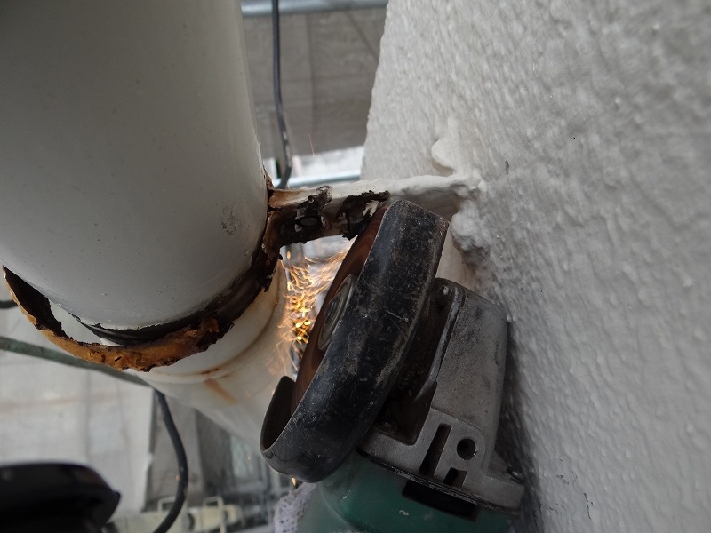 樋つかみの撤去も進めます。ボルトは固着して取れないから、サンダーでカット!