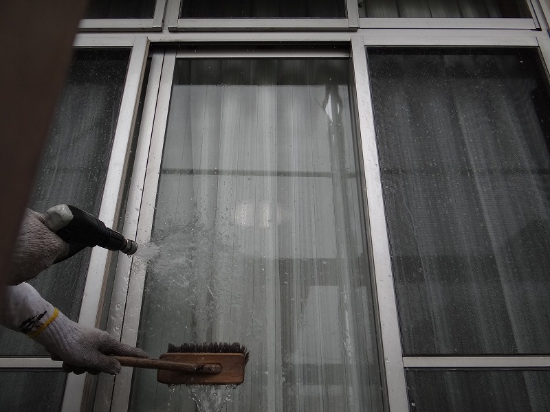 昨日、仮設足場の設営が完了したので、まずは高圧洗浄を行いました。