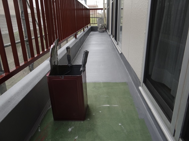 外壁の塗装は、ほぼ完了したので、バルコニーの防水を進めました。まずは素地調整を行ったり、