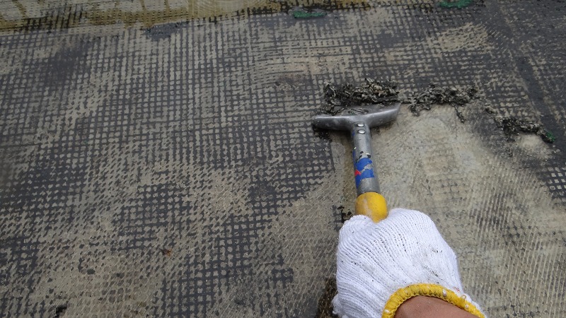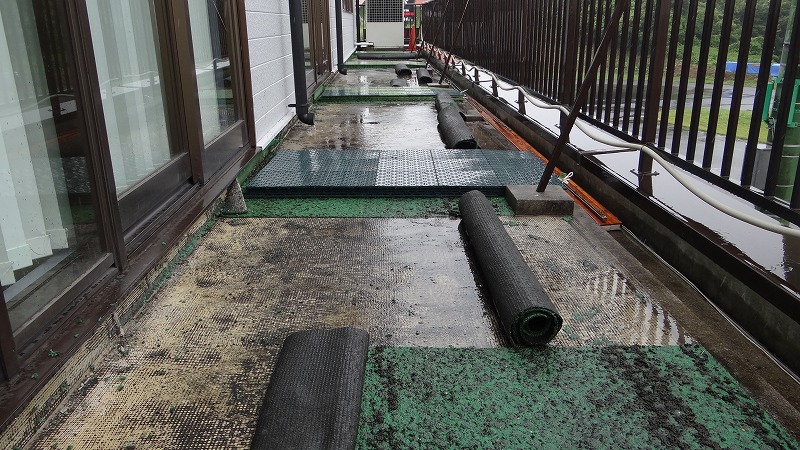 防水の仕上がったバルコニーへ、物干し台などを元の場所に戻しておりました。仕上がった防水を傷つけない様、長尺シートを敷いて完了です。