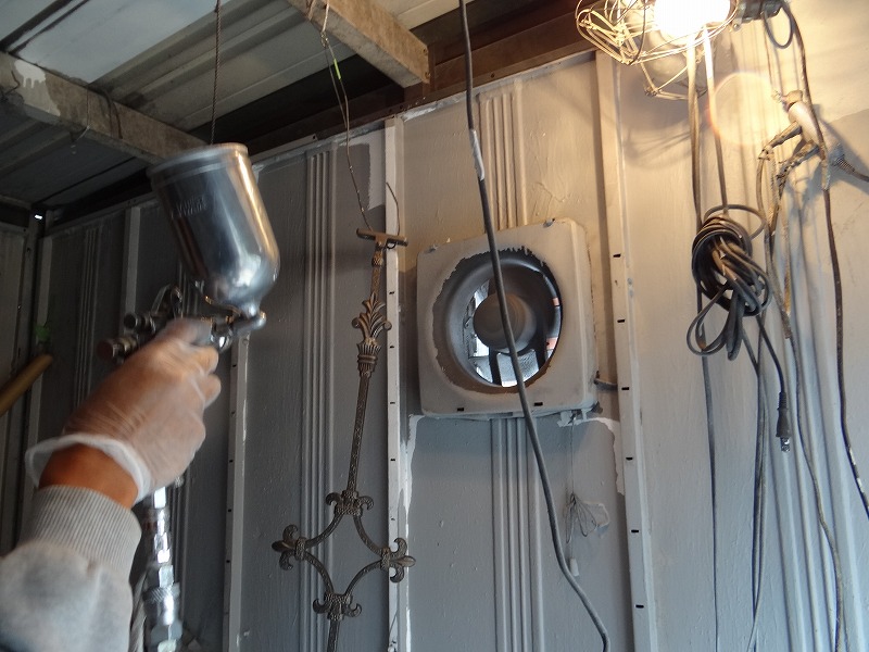 昨日の続きでスロープの柱の修理を進めます。仕上げの塗装を行って、