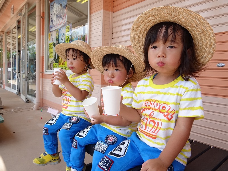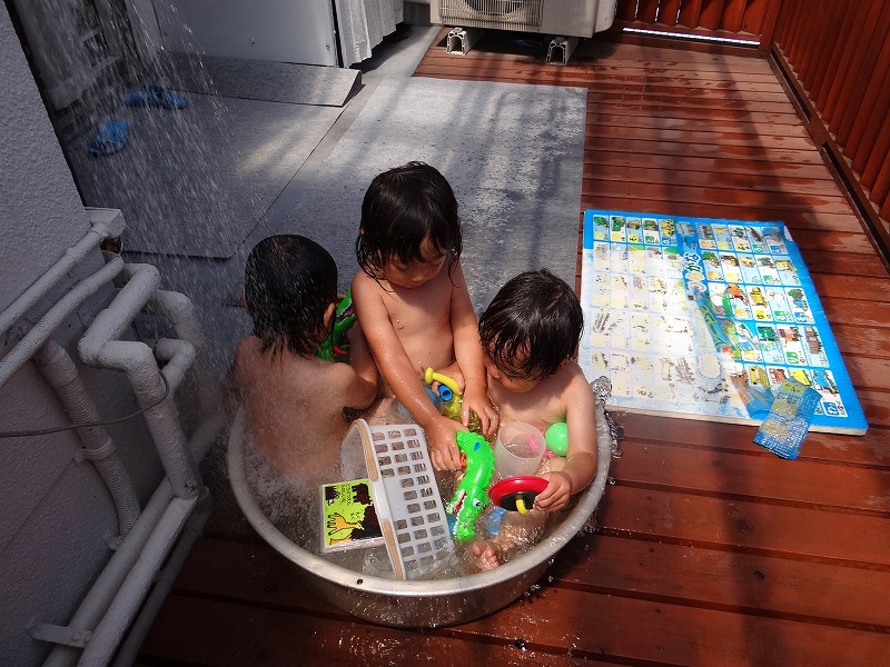 ベランダで水遊び。もうチビ達も大きくなったので1つのたらいでは狭いせまい。