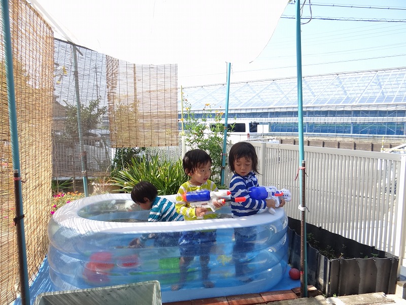 チビ達はお祖母ちゃん家でプール。明日は川で遊ぶので初めての水中眼鏡で練習です。