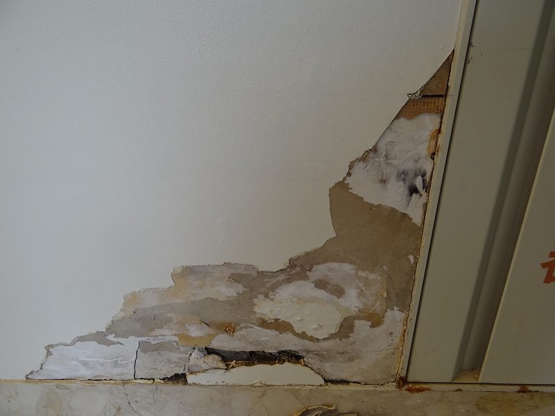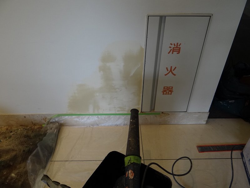 今回の工事は休館日と時間の制限があるのでスピード勝負。パテに硬化促進剤を入れブロアーで送風を送り乾燥を急ぎます。
