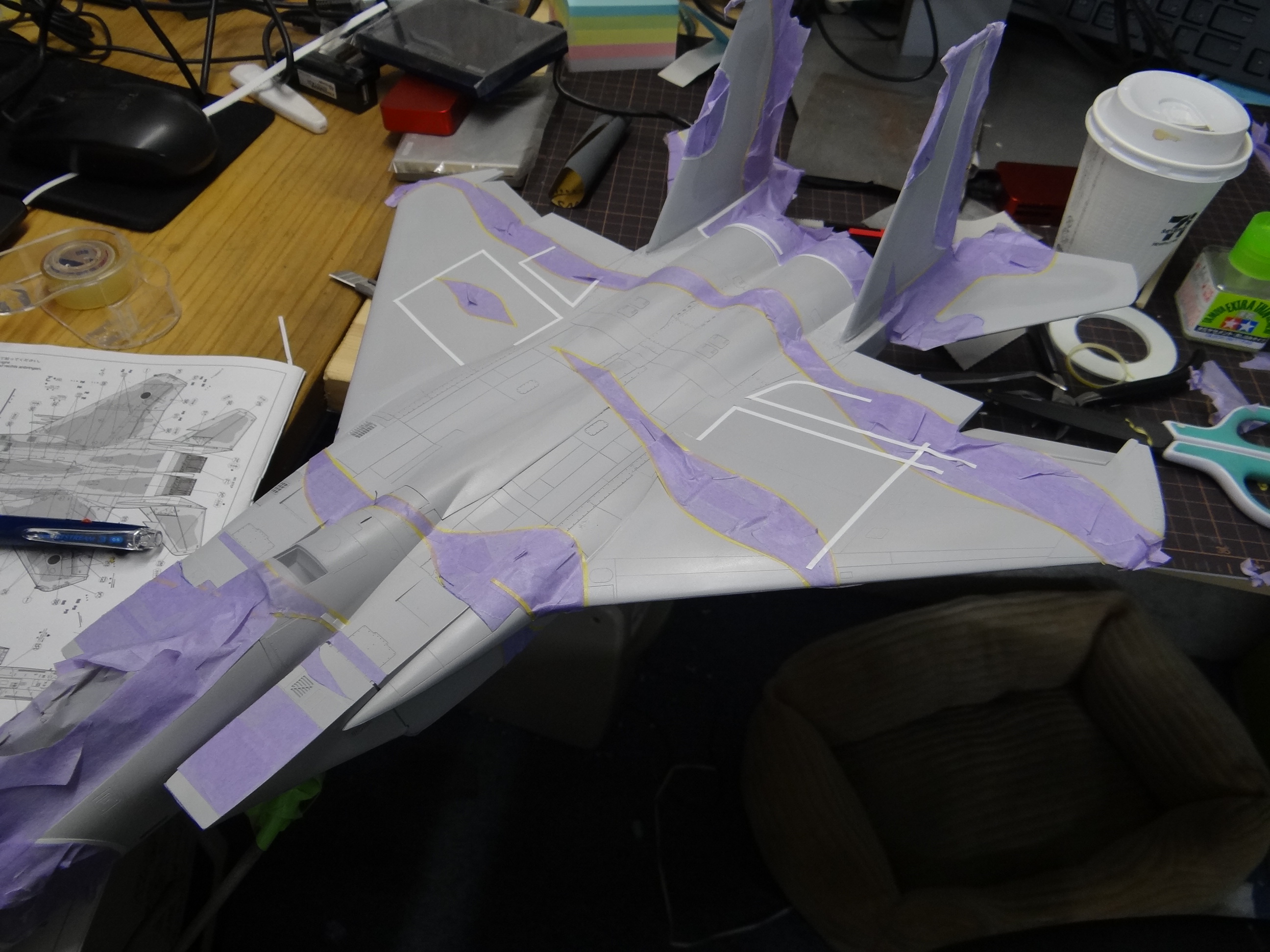 今朝も早朝プラモ。今度は色の塗り分け。最初は教科書通り型紙を使っていましたが、現場へ行く時間が迫ってきたので途中からフリーハンド。帰宅後はせっせとマスキング。今晩もモーレツ大変な時間が続きます。。