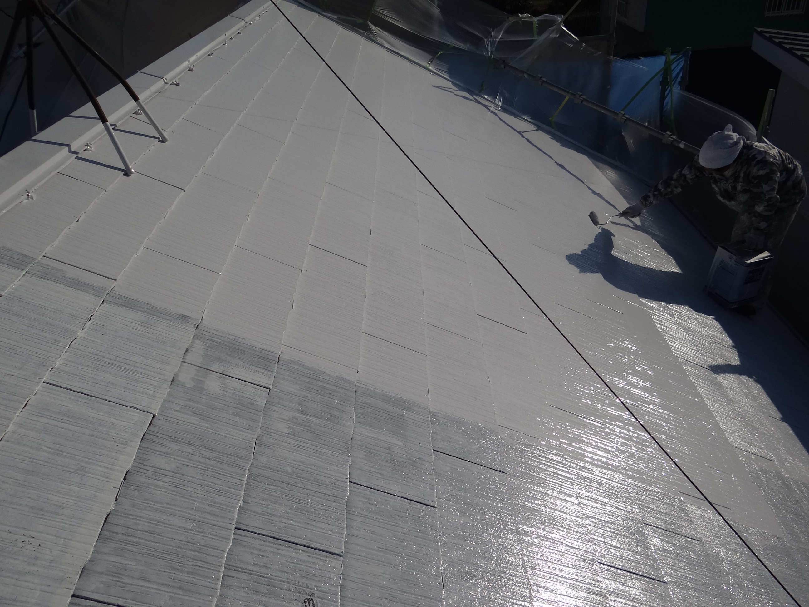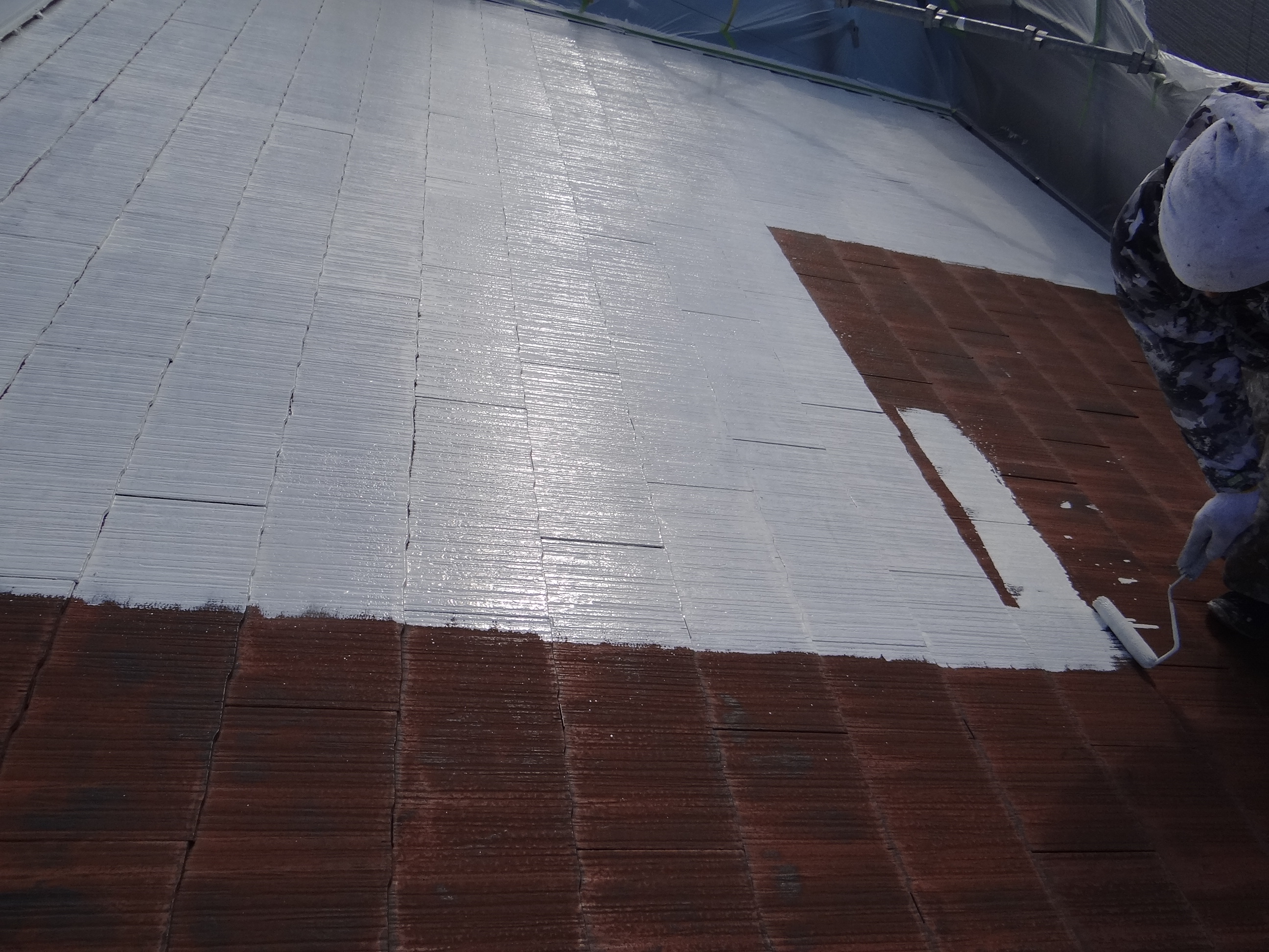下塗り塗布施工中。この数年、屋根の遮熱を考慮して白色の塗料で塗る事が多くなりました。