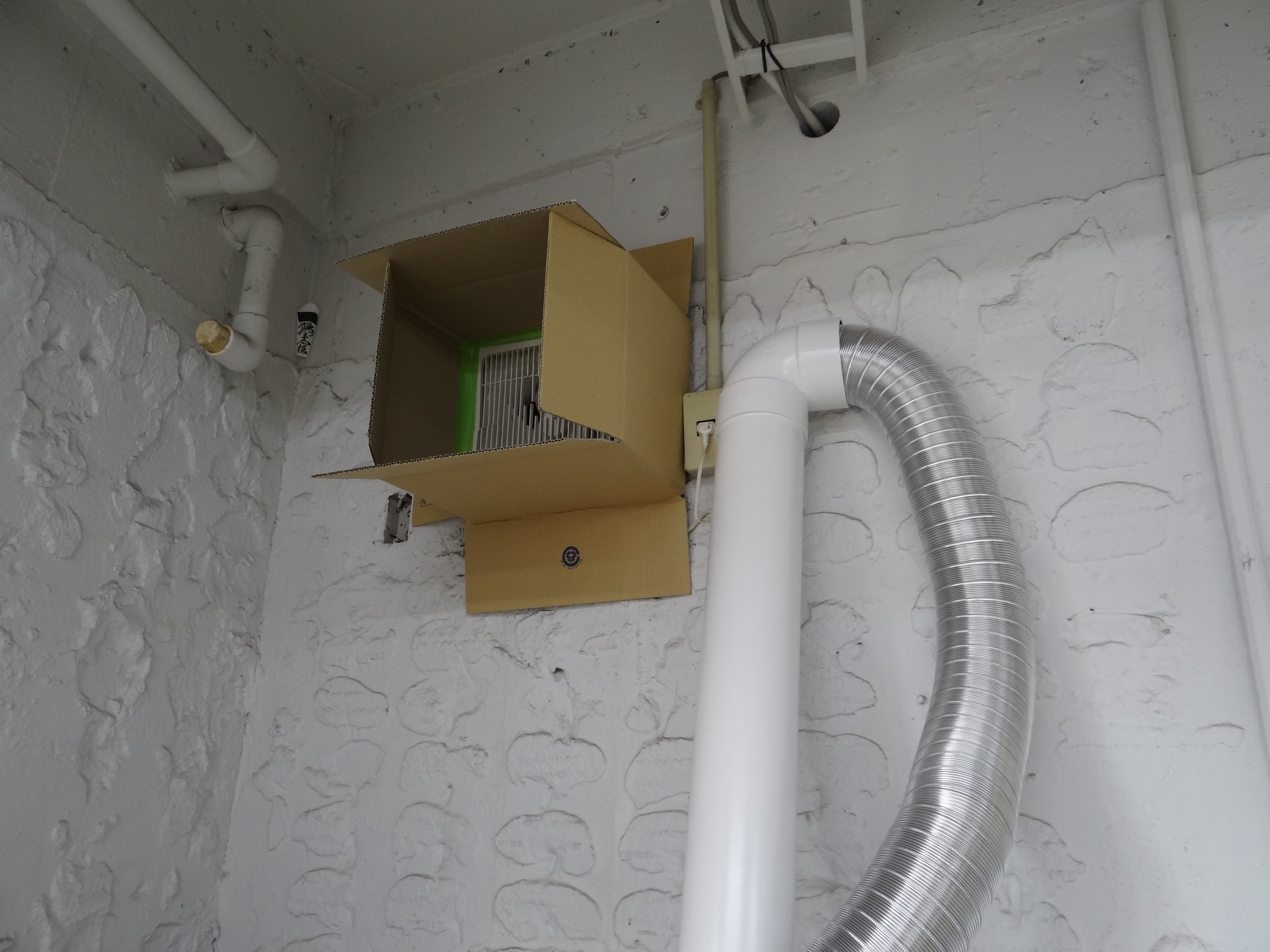 さーて倉庫にプラモデルの塗装ブースでも作ろうかな?ちょうどいい位置に換気扇があるから排気のテストでもしてます。