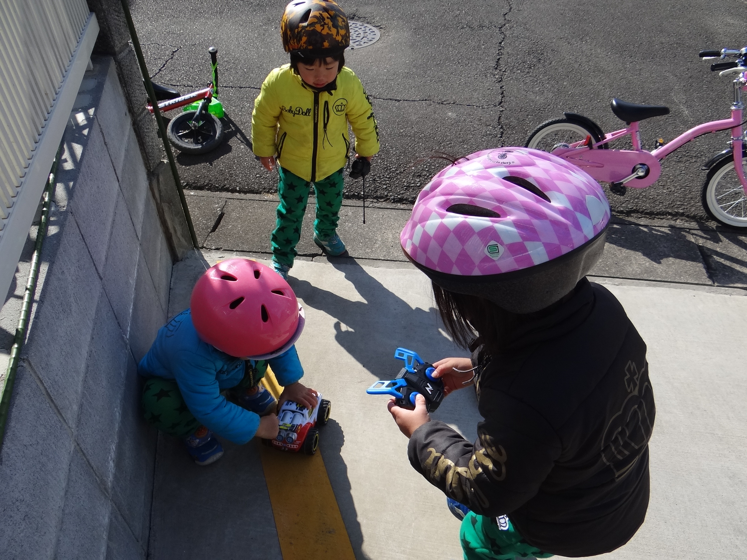 朝はちび達とストライダーと自転車。