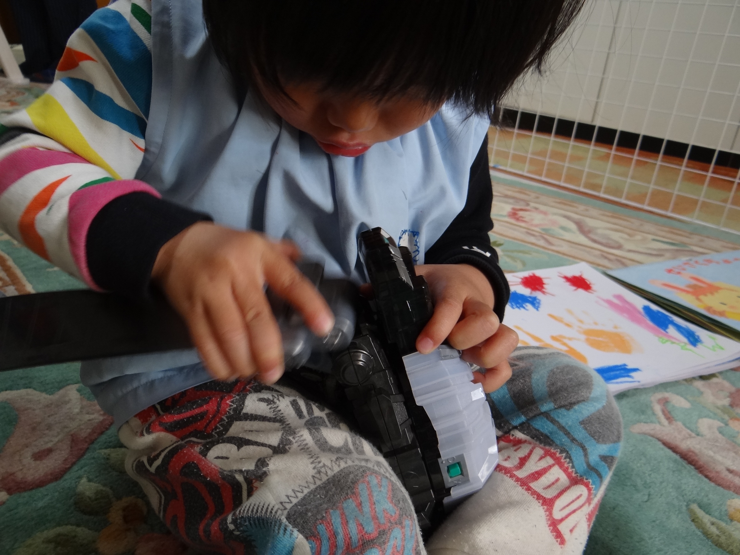 ライダーベルト装着。ちょっとお面のバランスが悪いけど。アンパンマンかぁ。。。