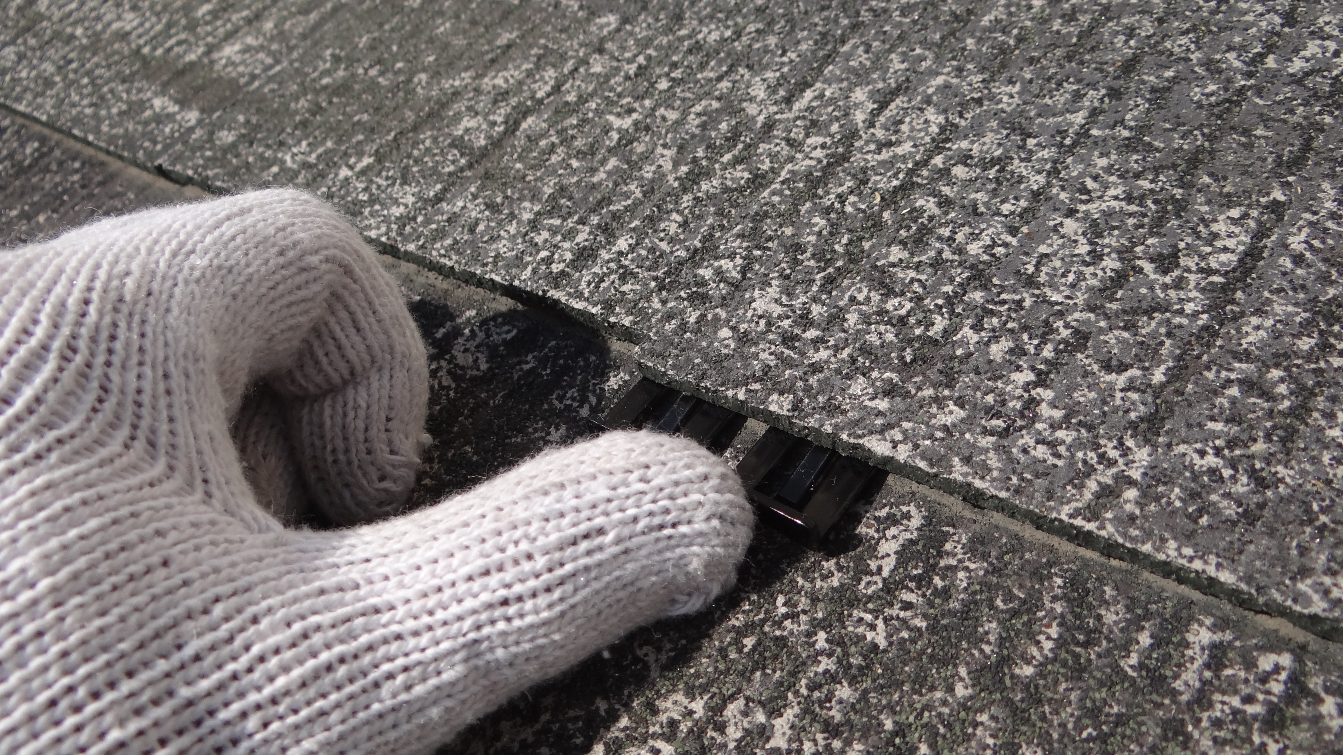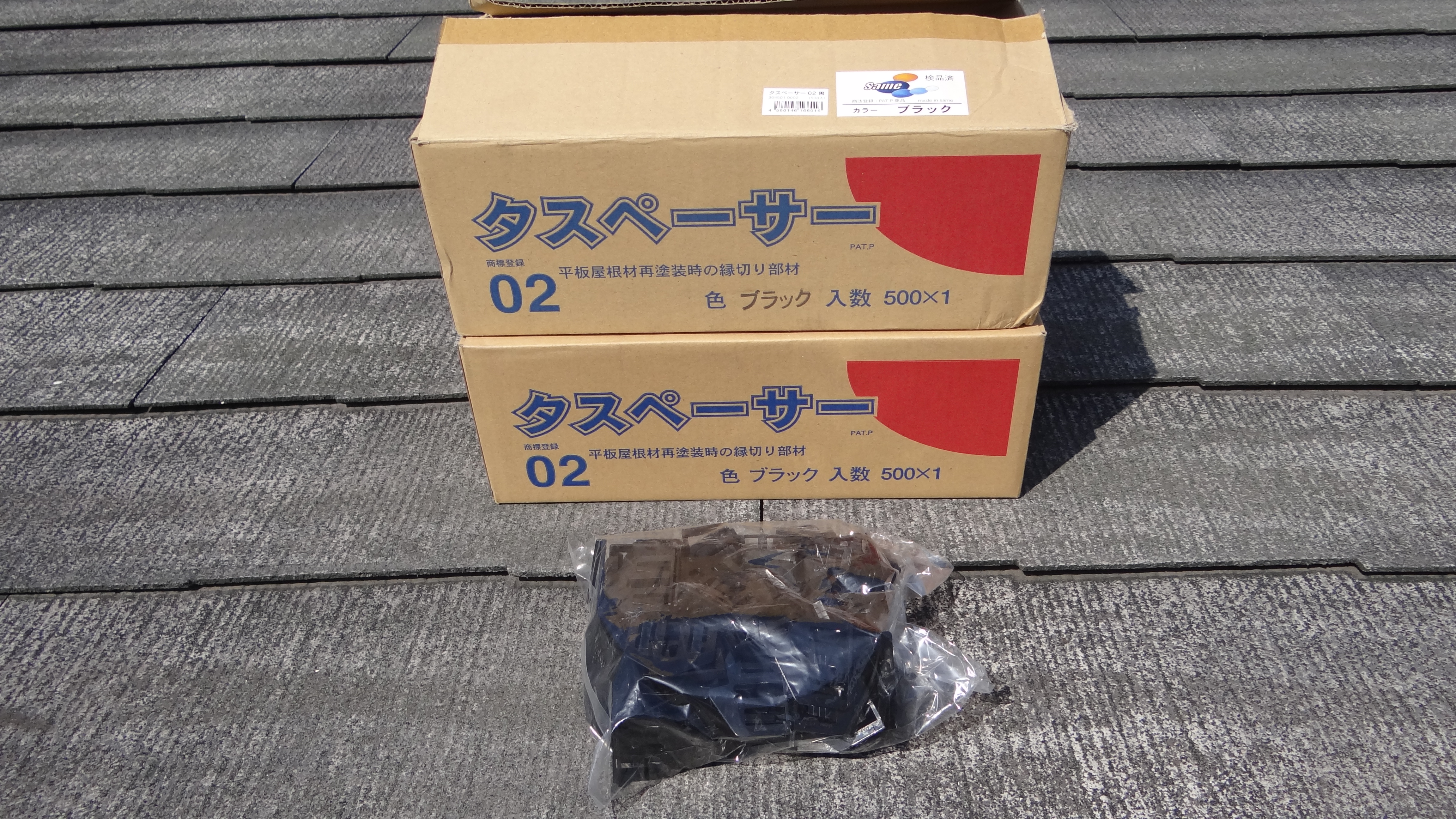 カラーベスト屋根の洗浄・乾燥後、タスペーサーの設置を行います。