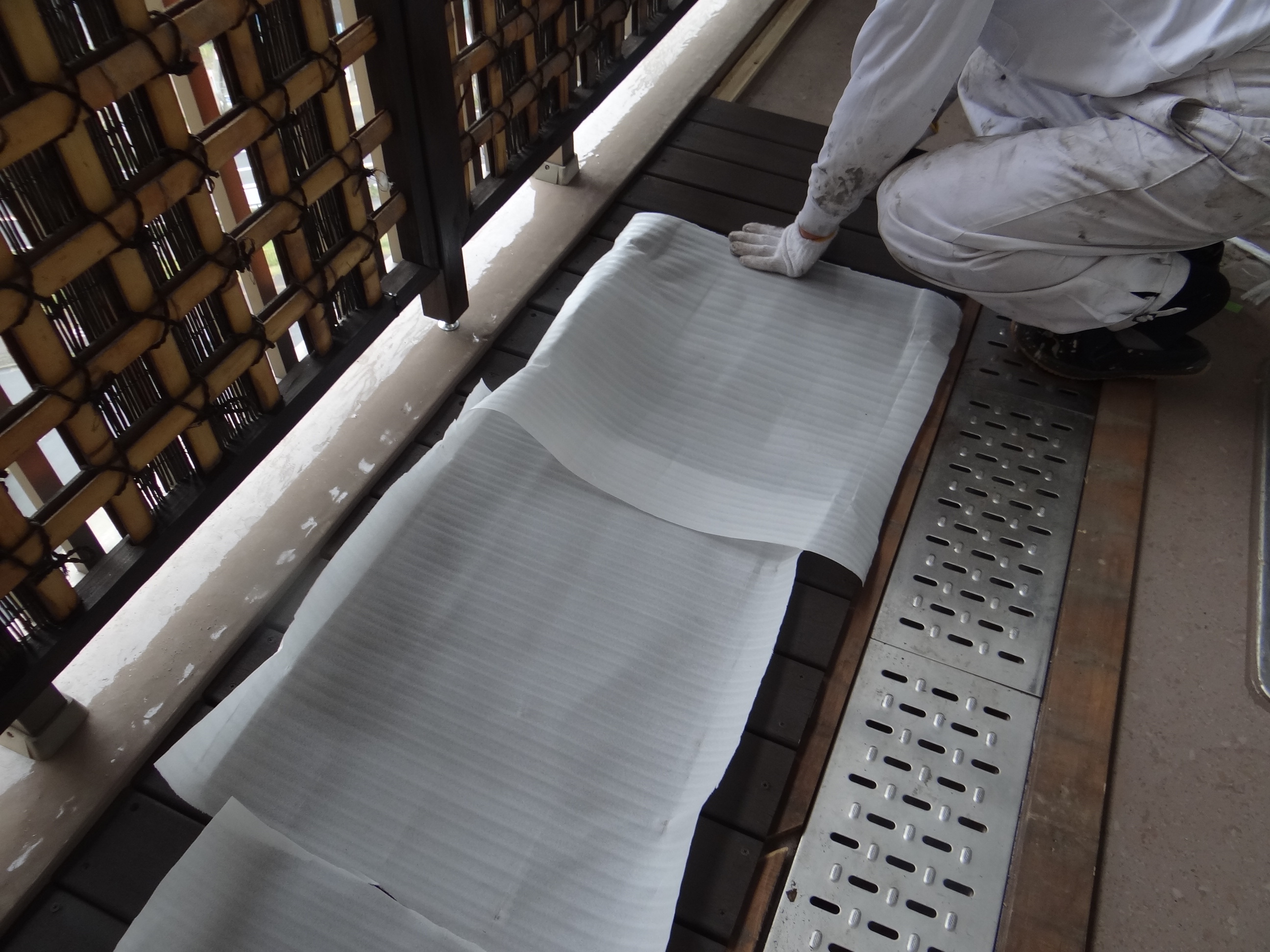昨日塗装を行った木部材を搬入するので傷を付けないようしっかりと養生。