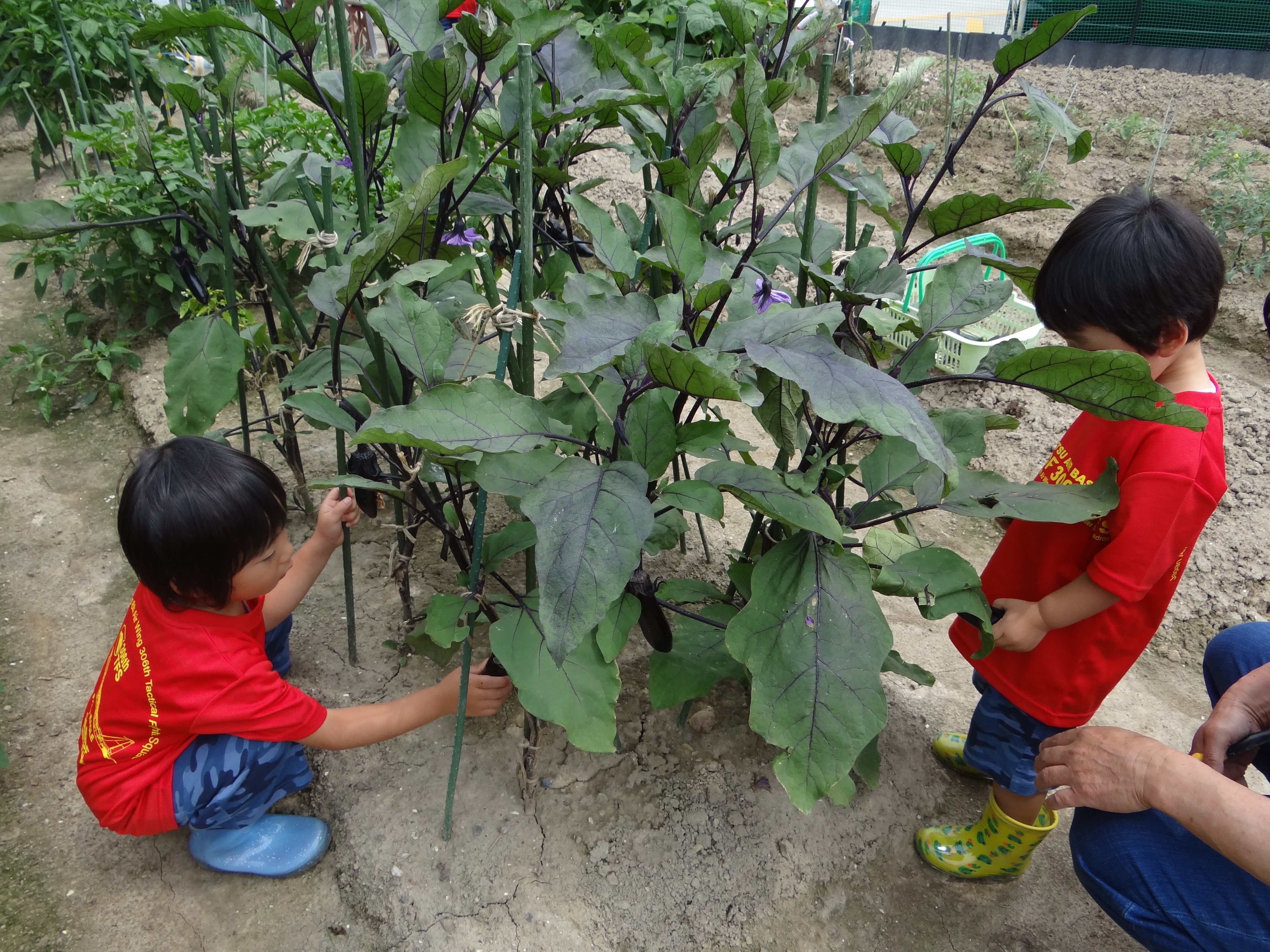 お昼からは、お義父さんの畑でナスやキュウリを取りました。