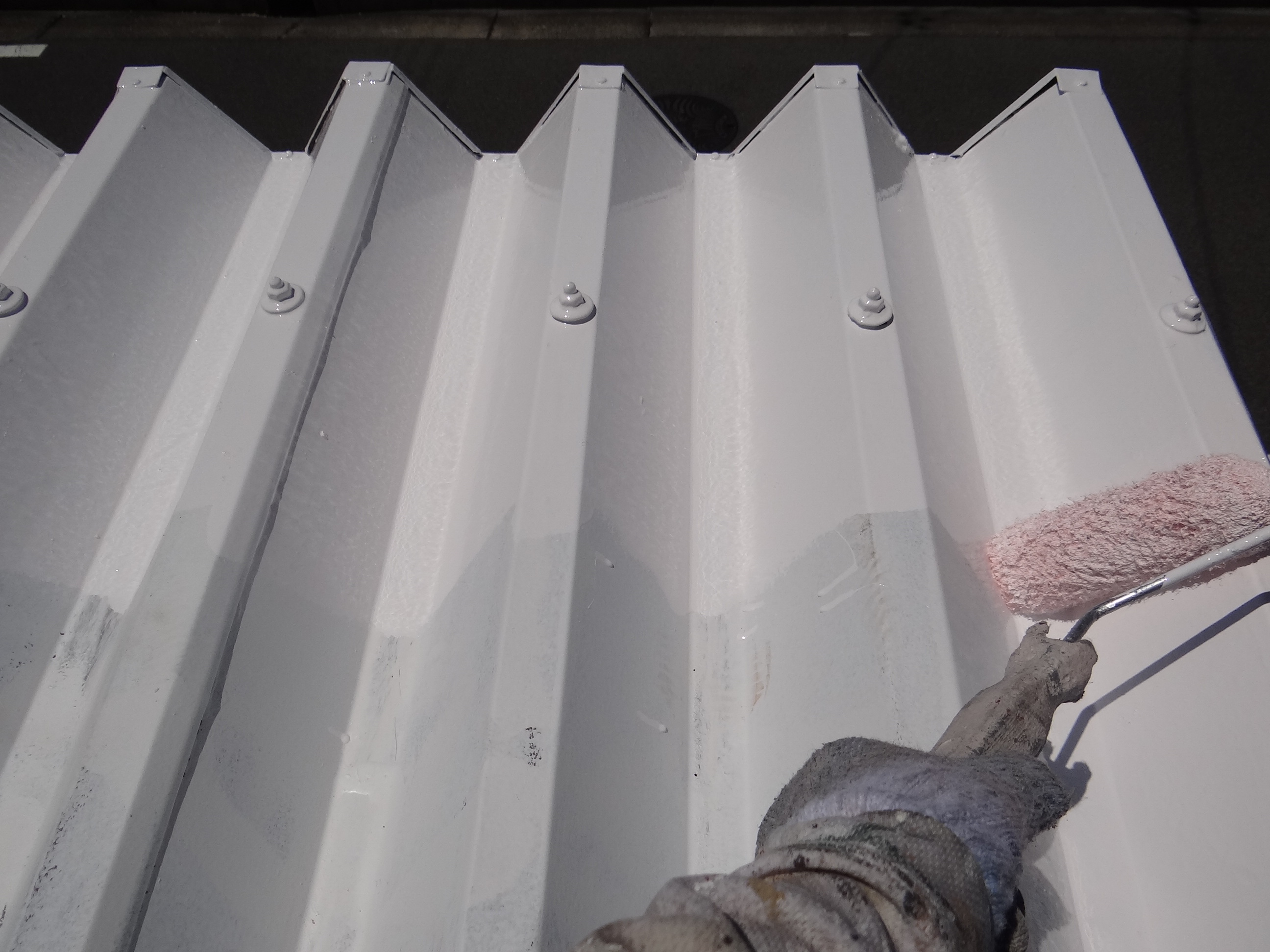 屋根は凄い熱をもっているので、錆止めはすぐに乾きます。なので中塗りをコロコロと塗布。