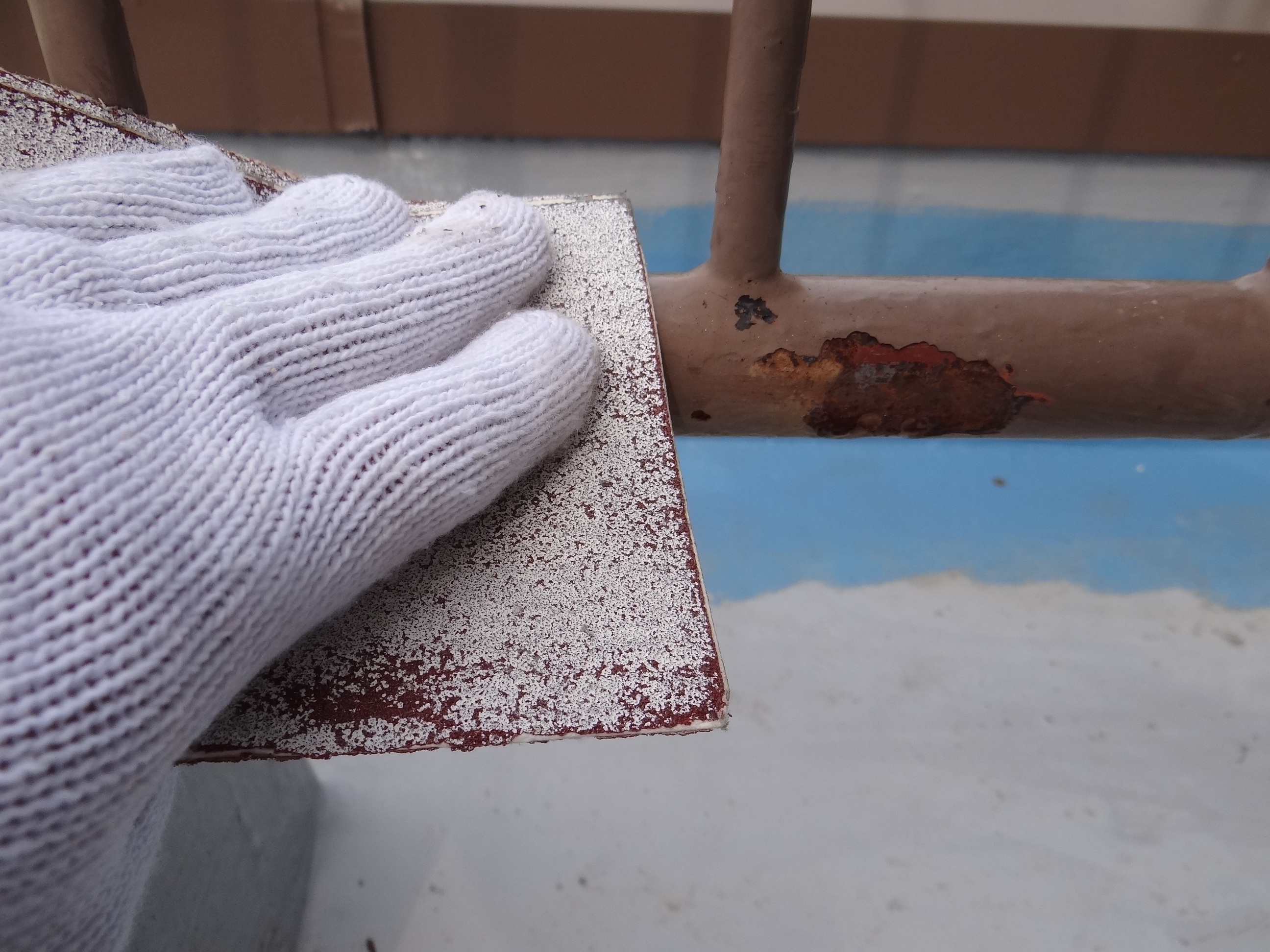 手摺の塗装。まずはケレンを行い剥離した塗膜などを剥がしたり素地調整。