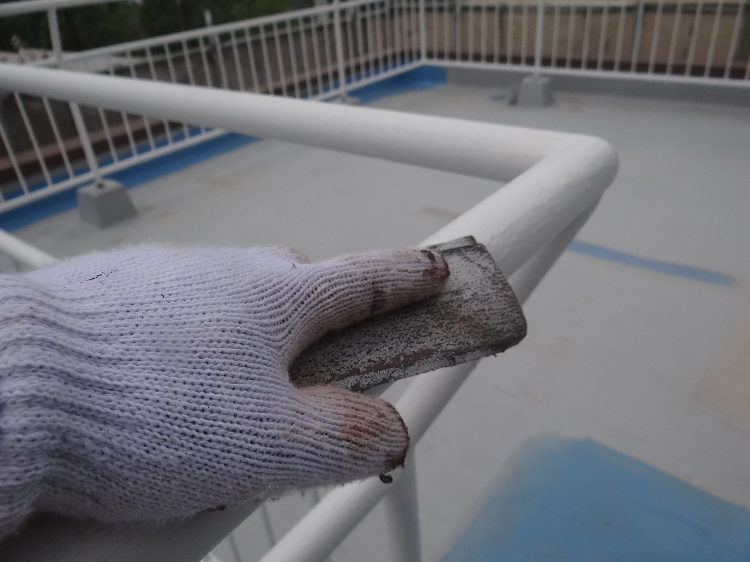 乾燥後、手摺にペーパーを当てて小さなゴミなどを取り除きます。