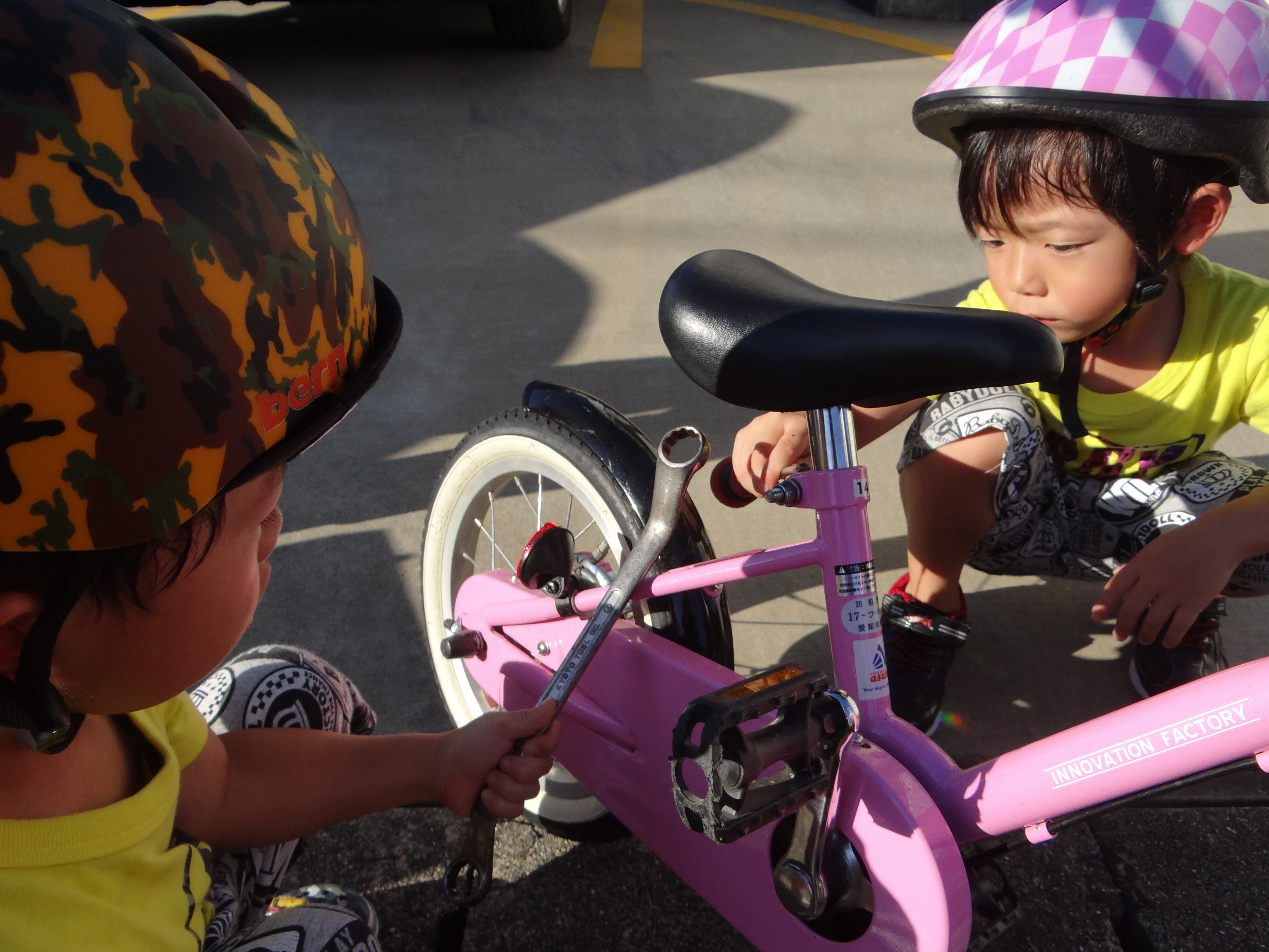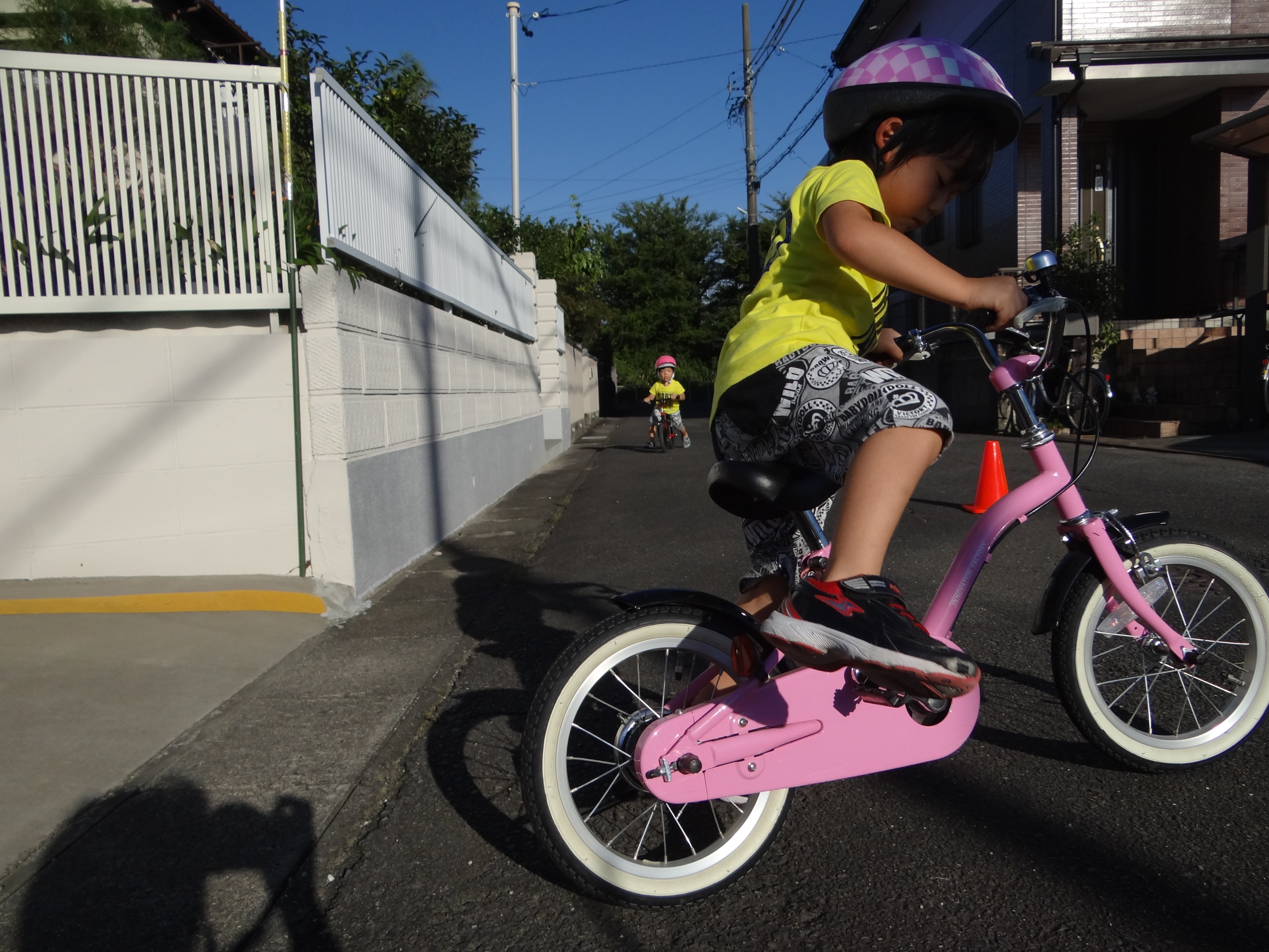 涼しくなった夕方からは自転車とストライダー。少し背が伸びたのでポジションを変更。そしてお邪魔虫。。