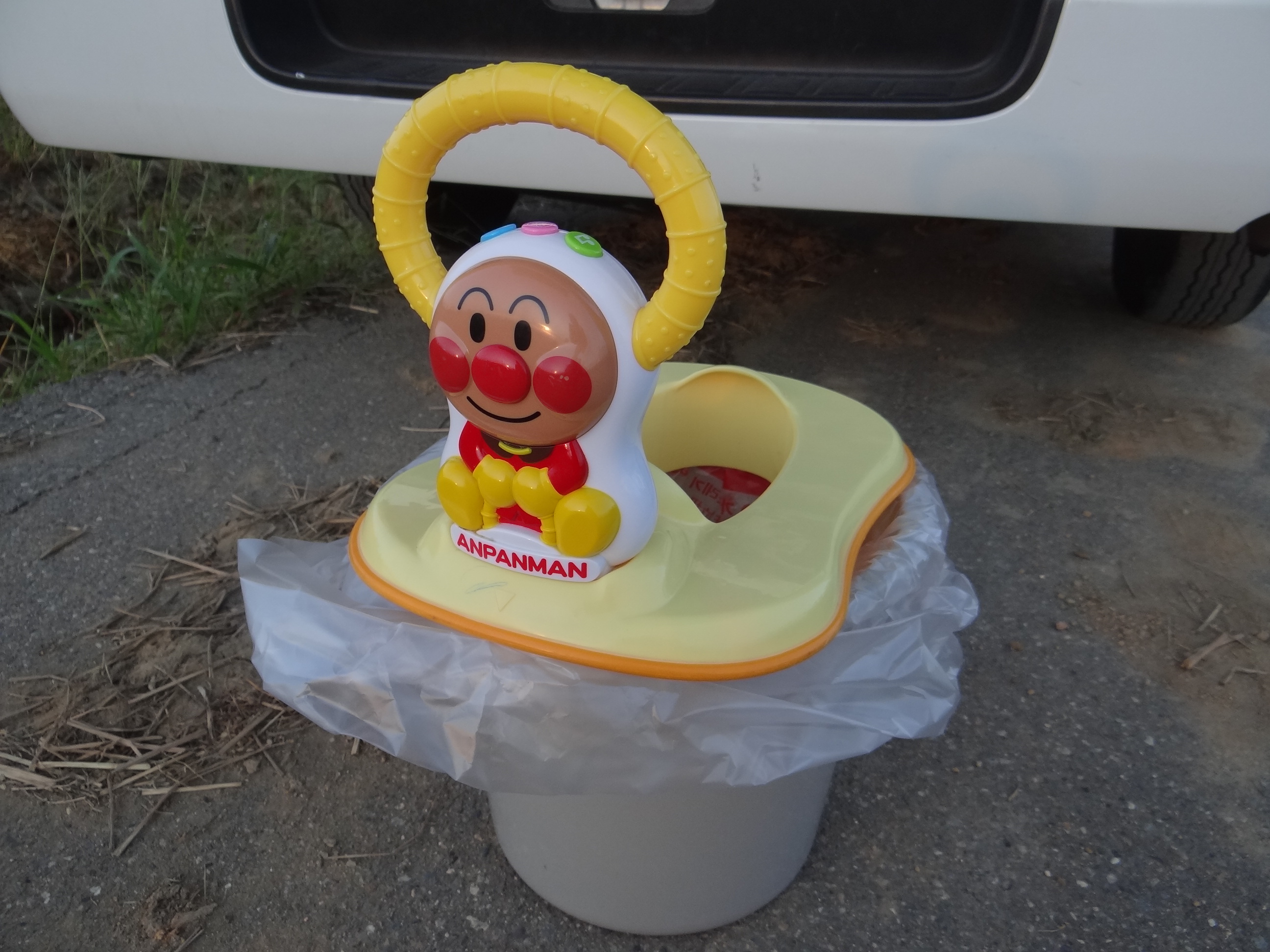 今回も用意した簡易トイレ。バケツにアンパンマンのおまるを乗せてペットシートを敷いて完成。トイレが無い時に助かります。