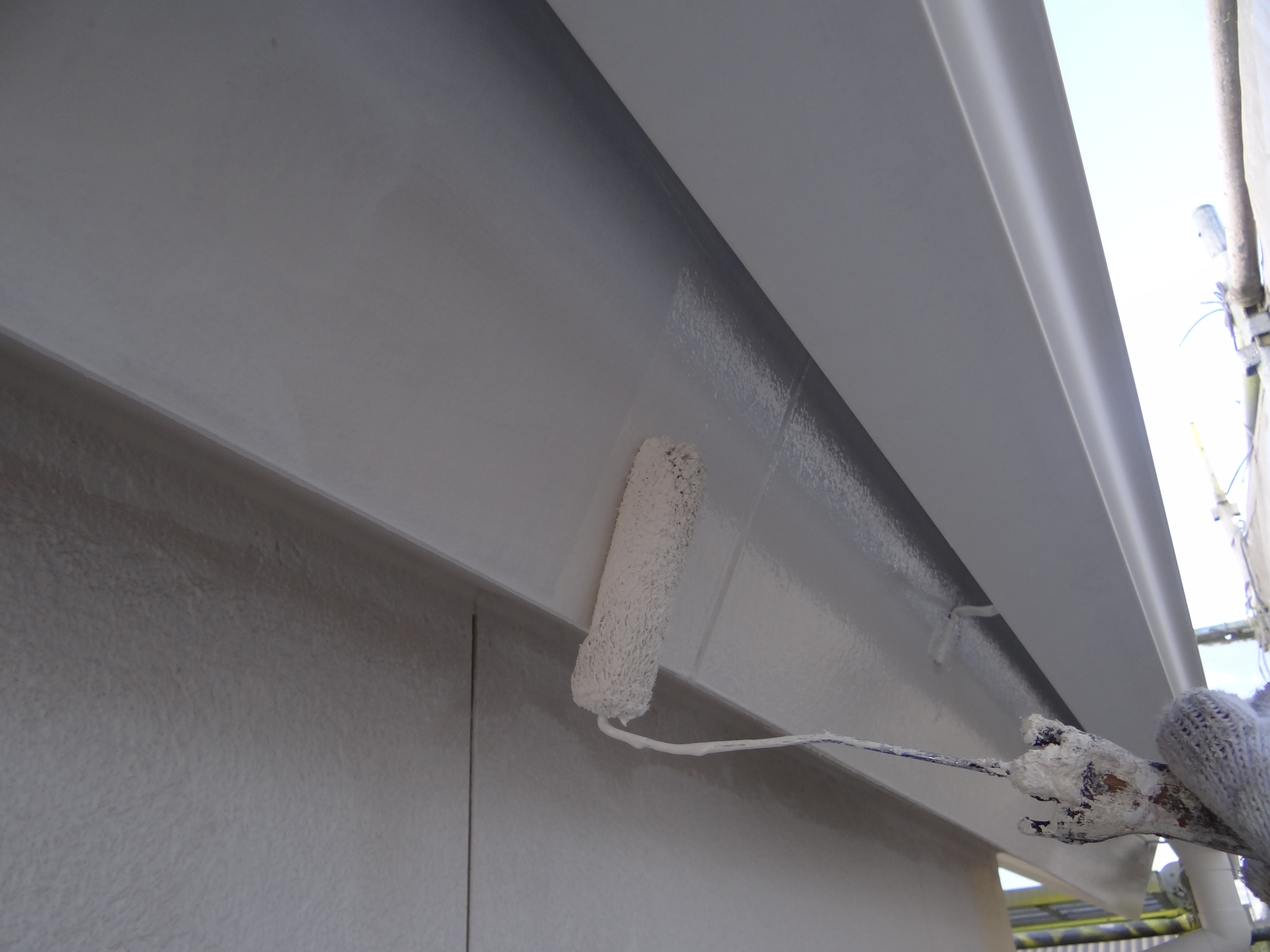 付帯箇所。軒樋や鼻隠しなどの中塗りもころころ~と塗布。