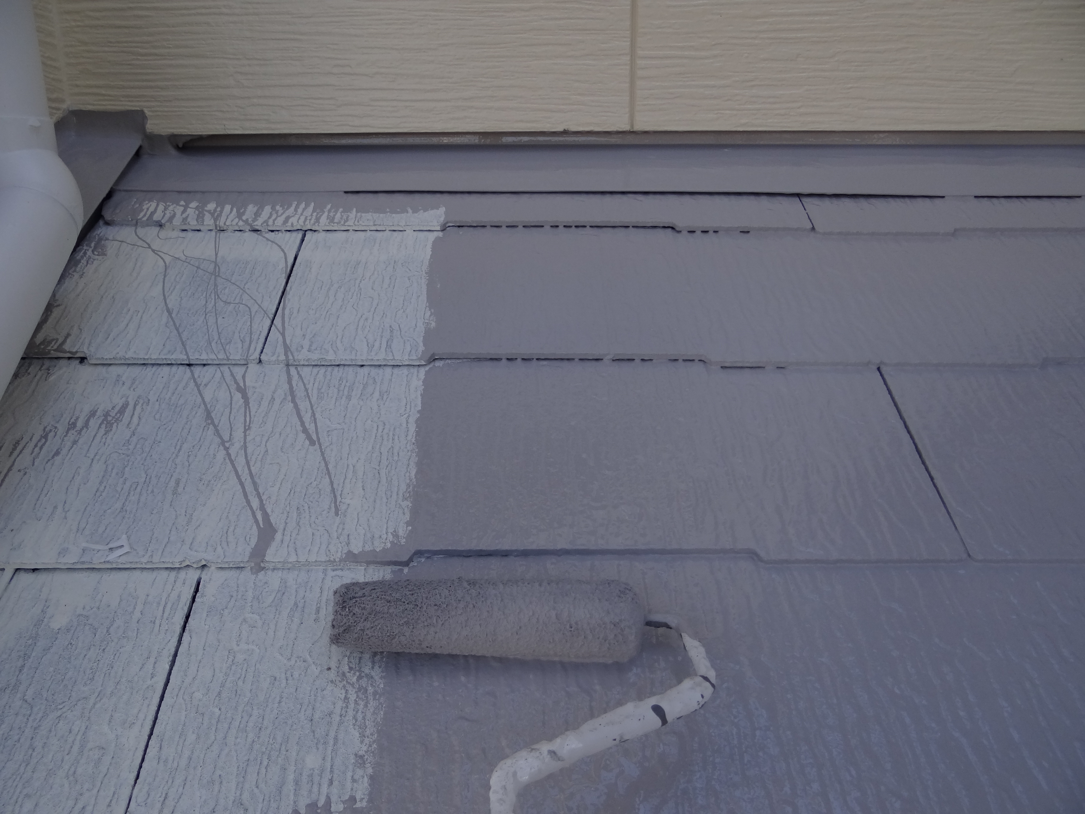塗装工事はカラーベスト屋根をフッ素樹脂の遮熱塗料でコロコロと塗布。