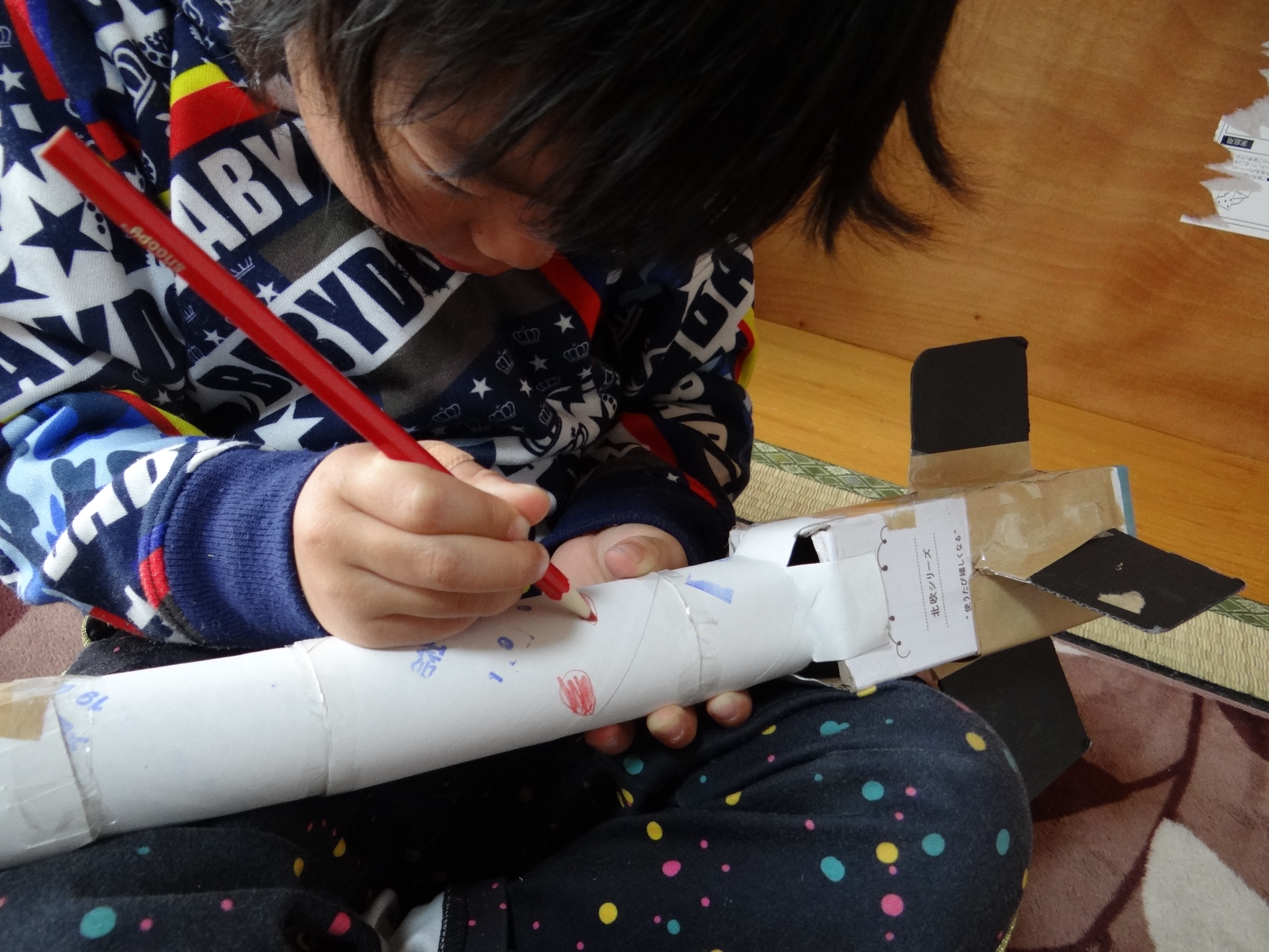 ロケットを作って日の丸を描く次男。さー始めよう。