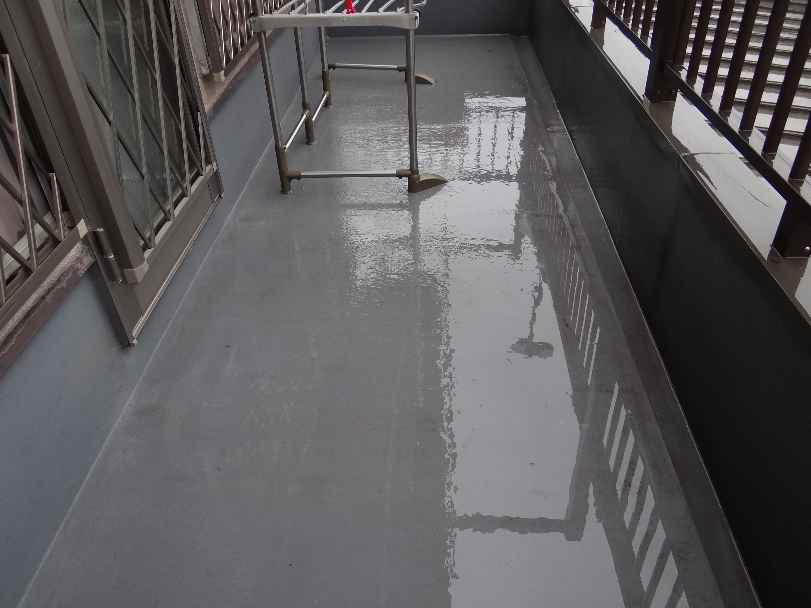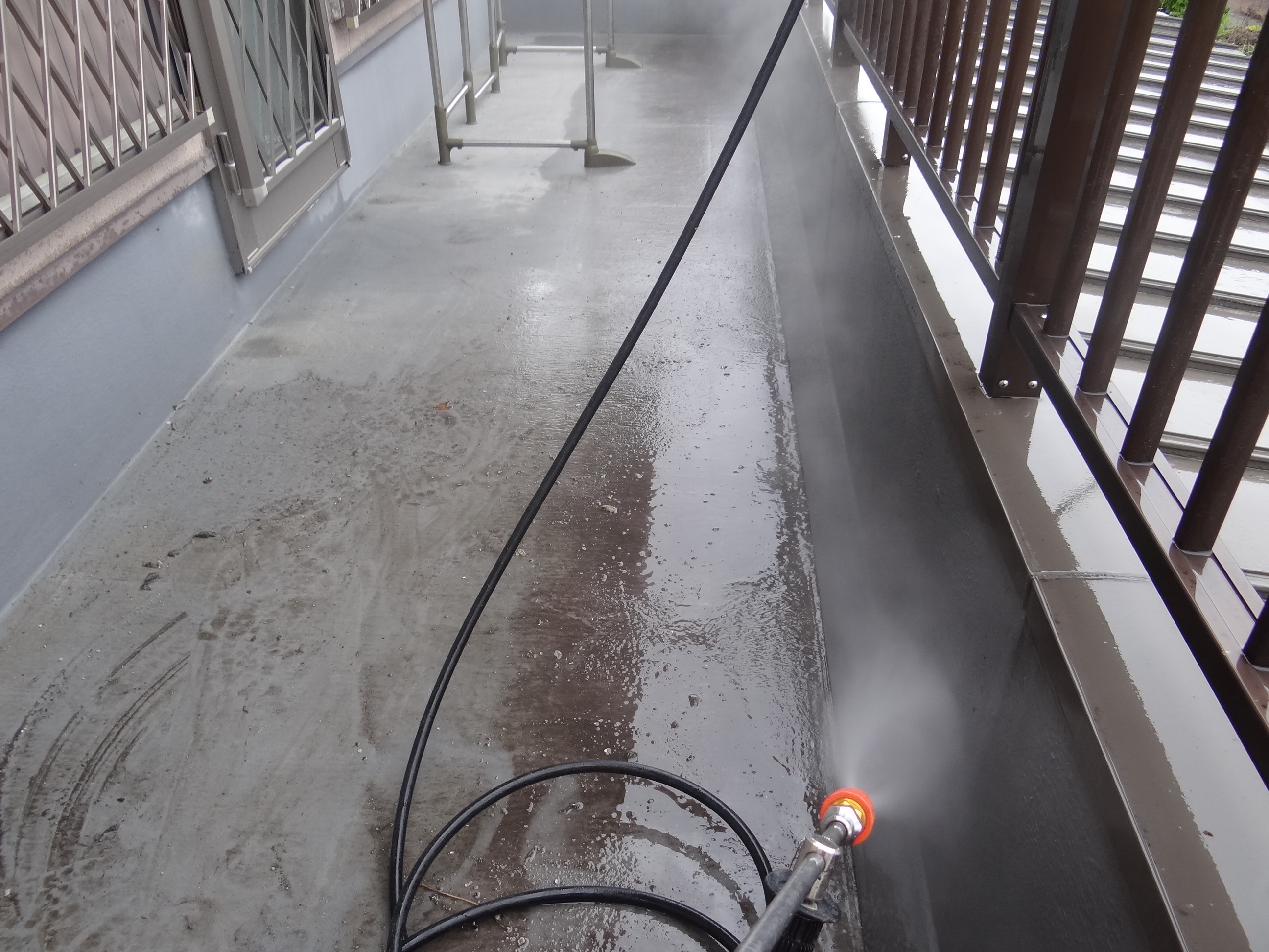 今日は好都合の雨の中、ベランダの洗浄を行いました。