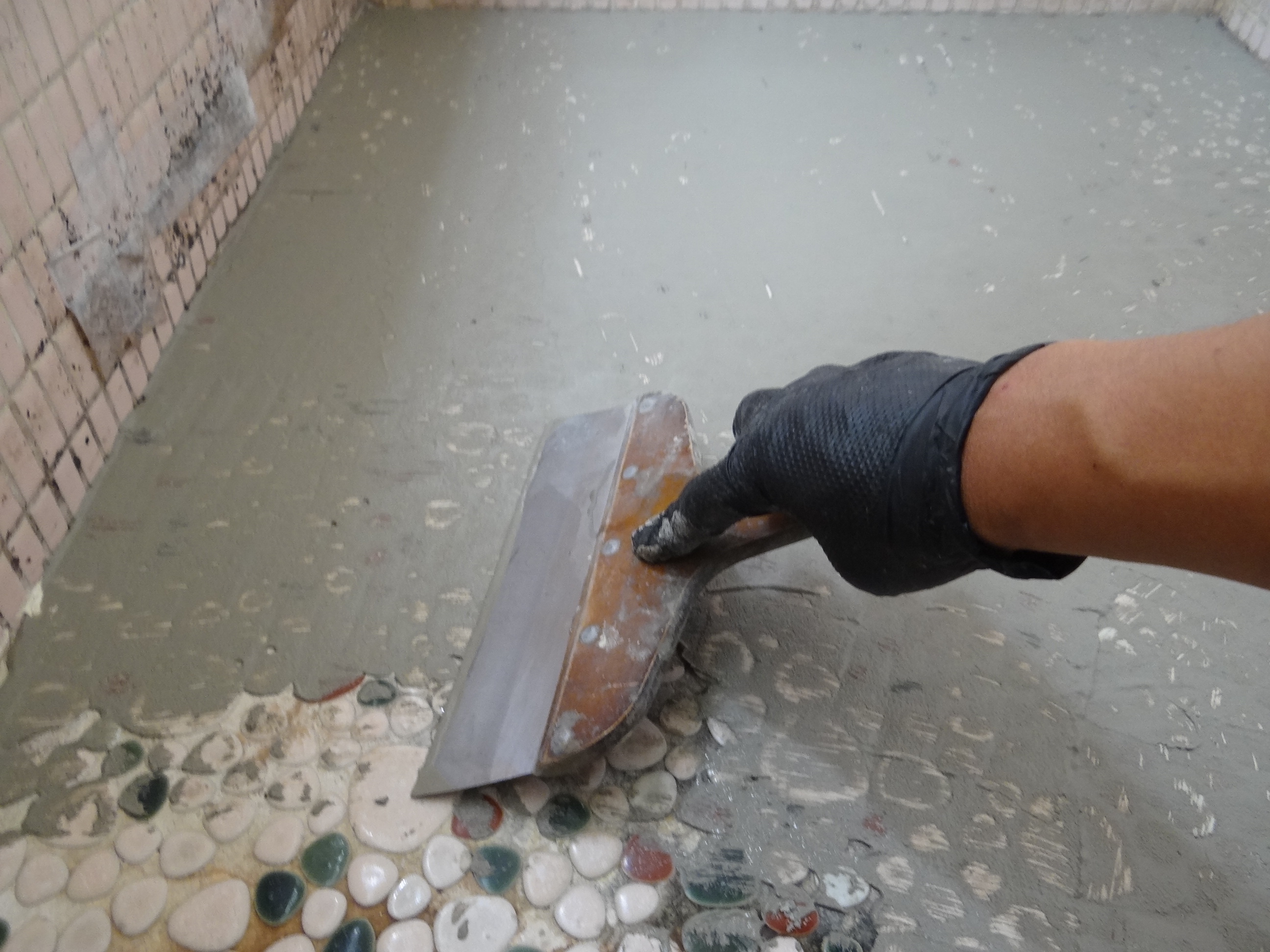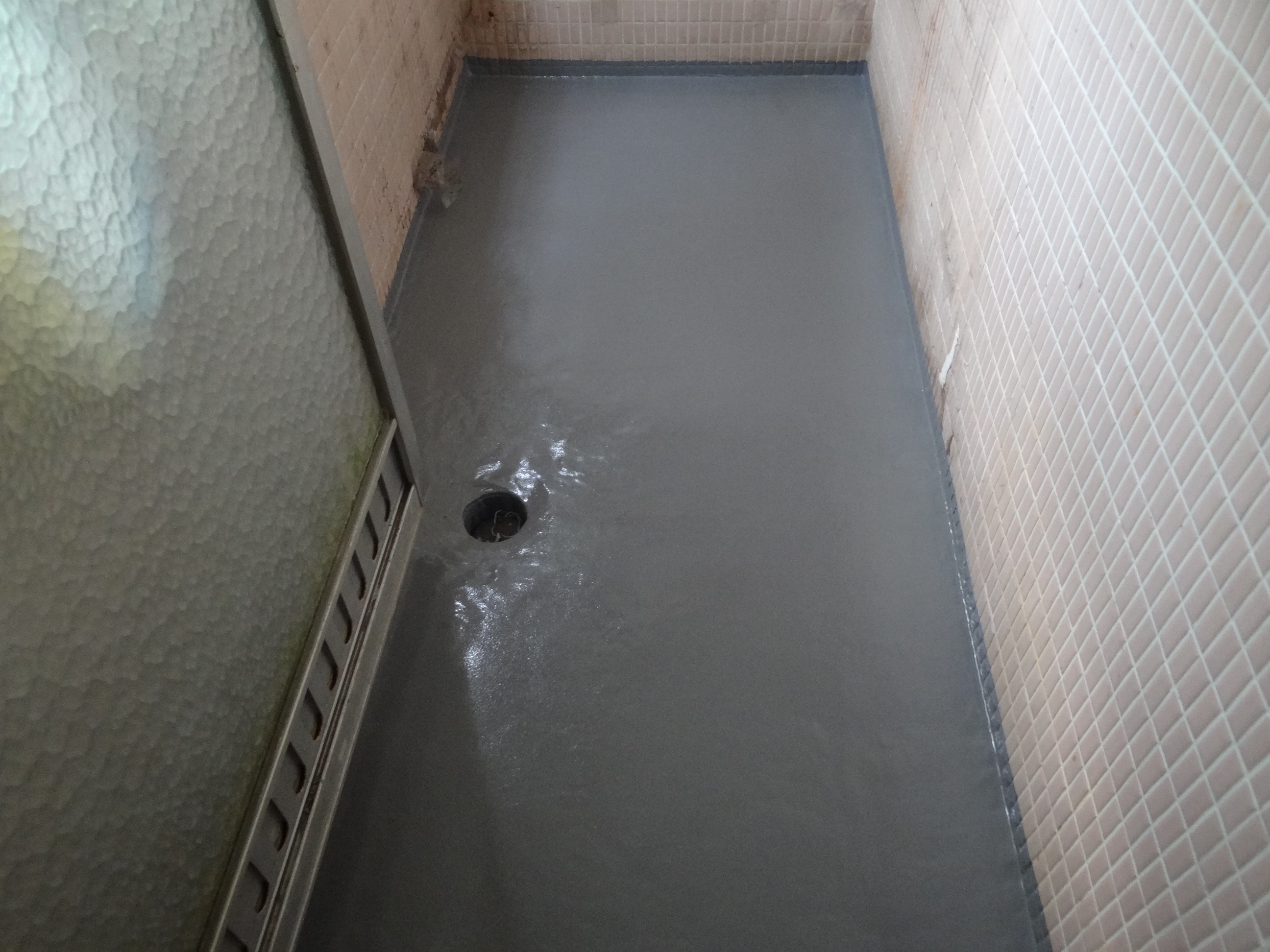ウレタンを流してトップ塗って、防水の完了。これで明日には浴槽を設置できます。お風呂の復旧は素早く致します。