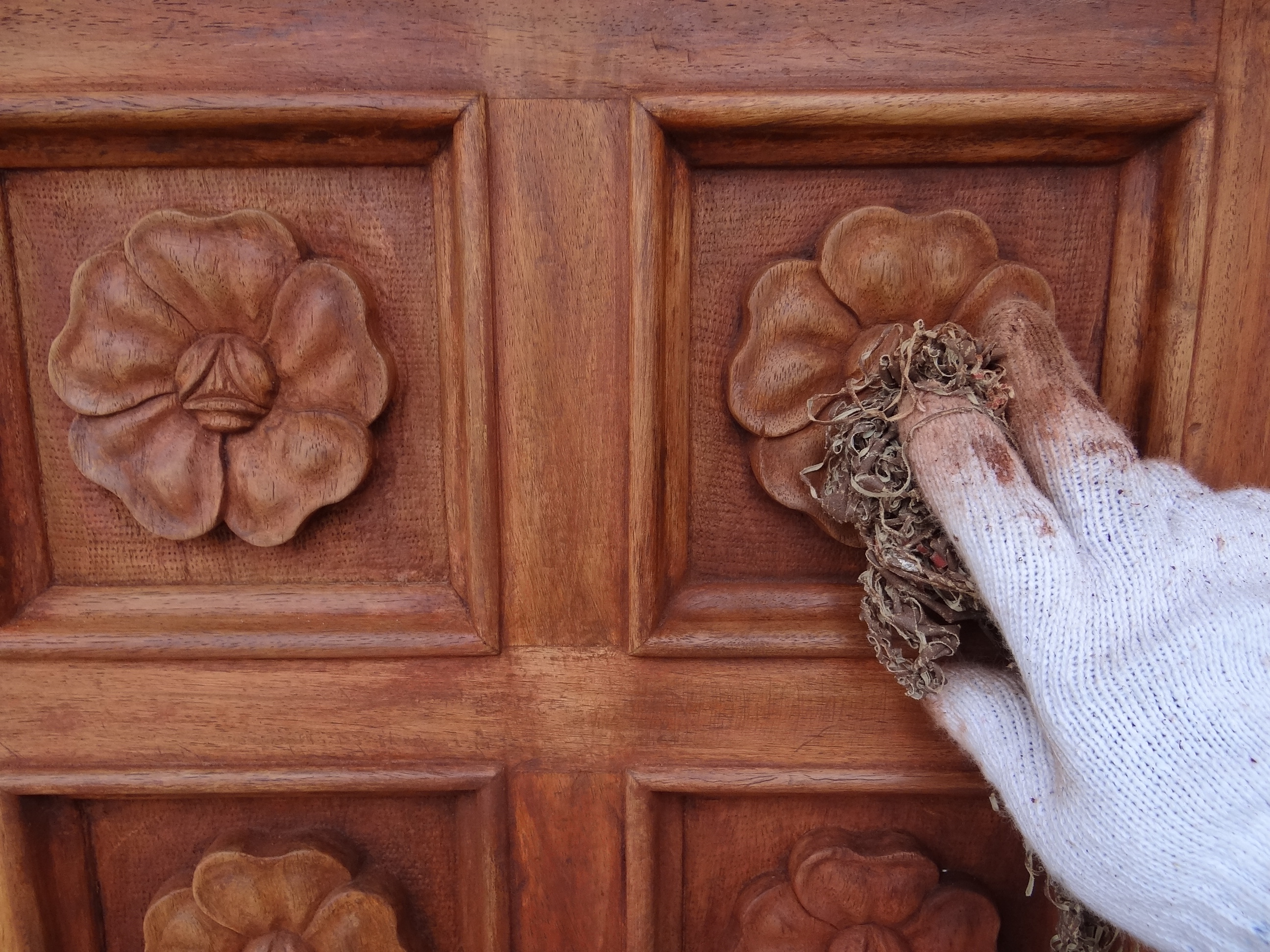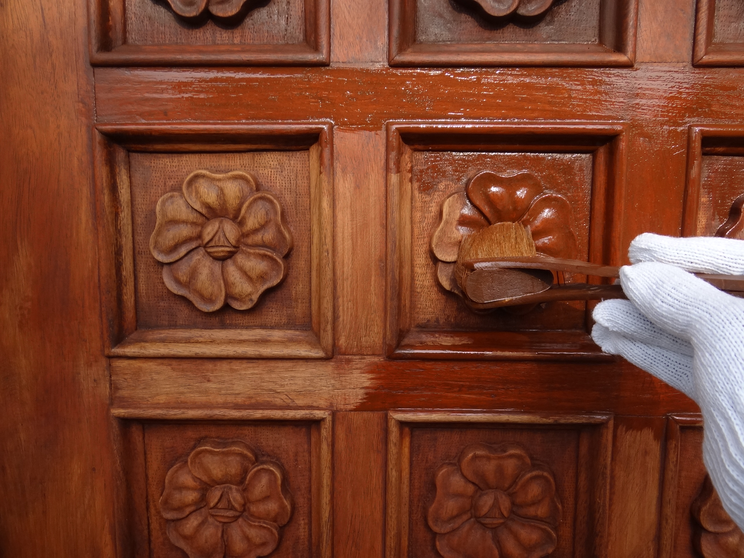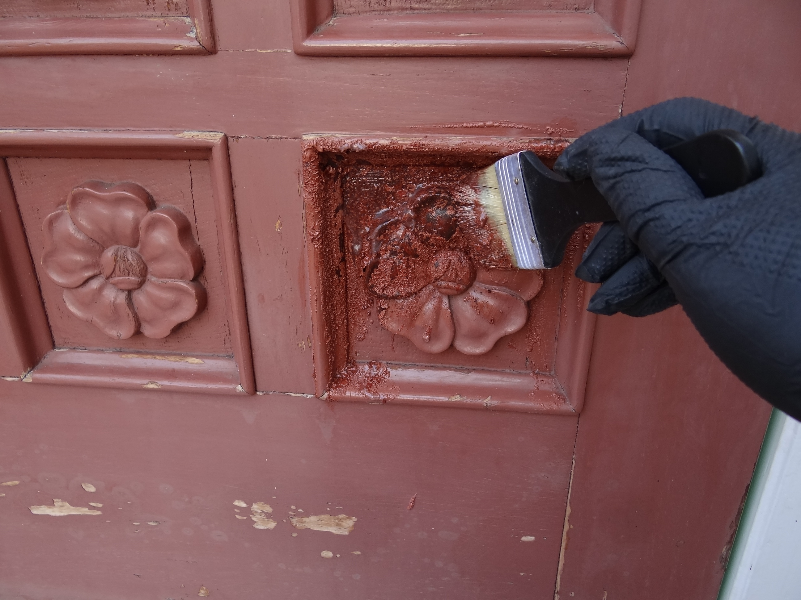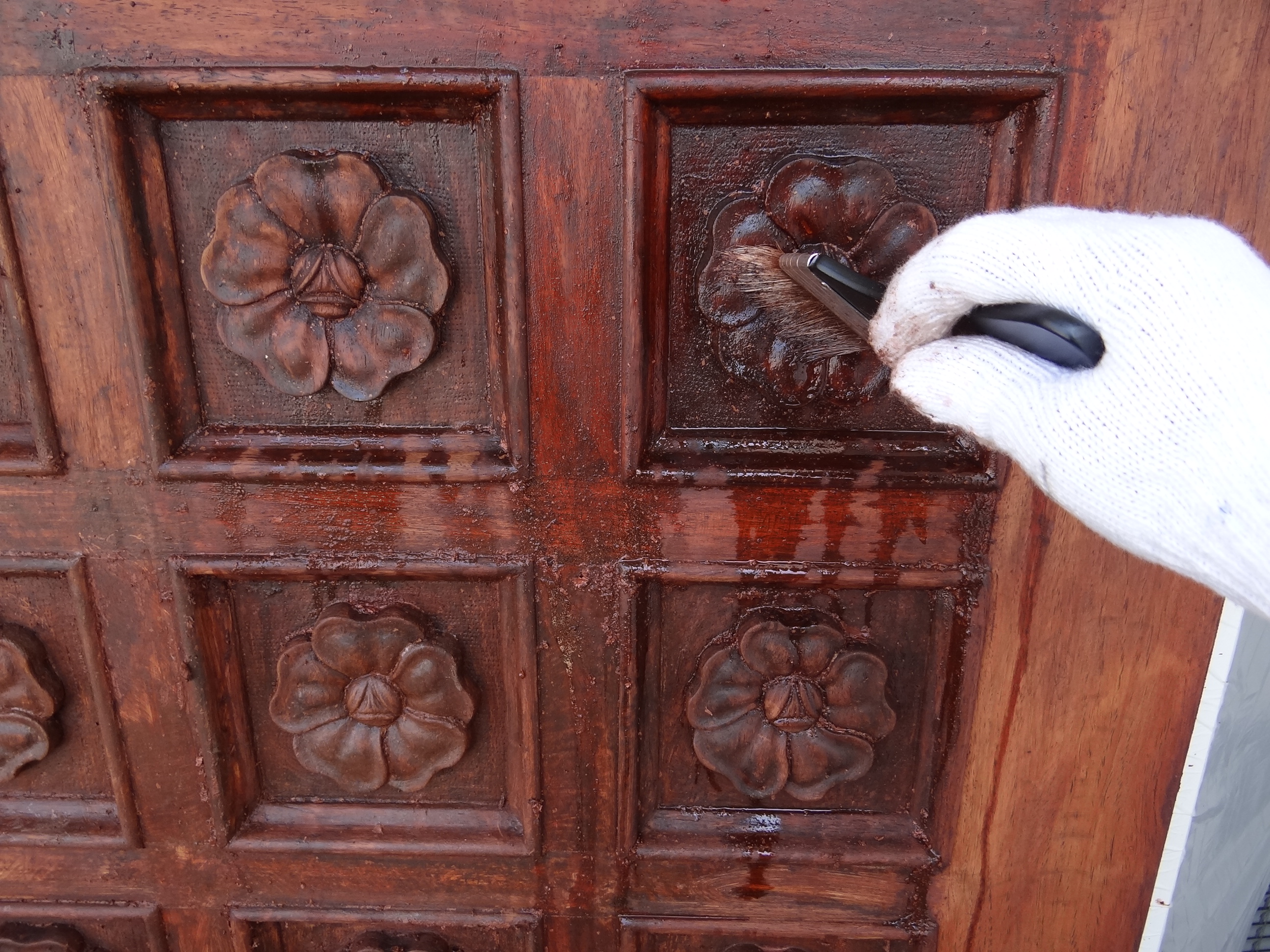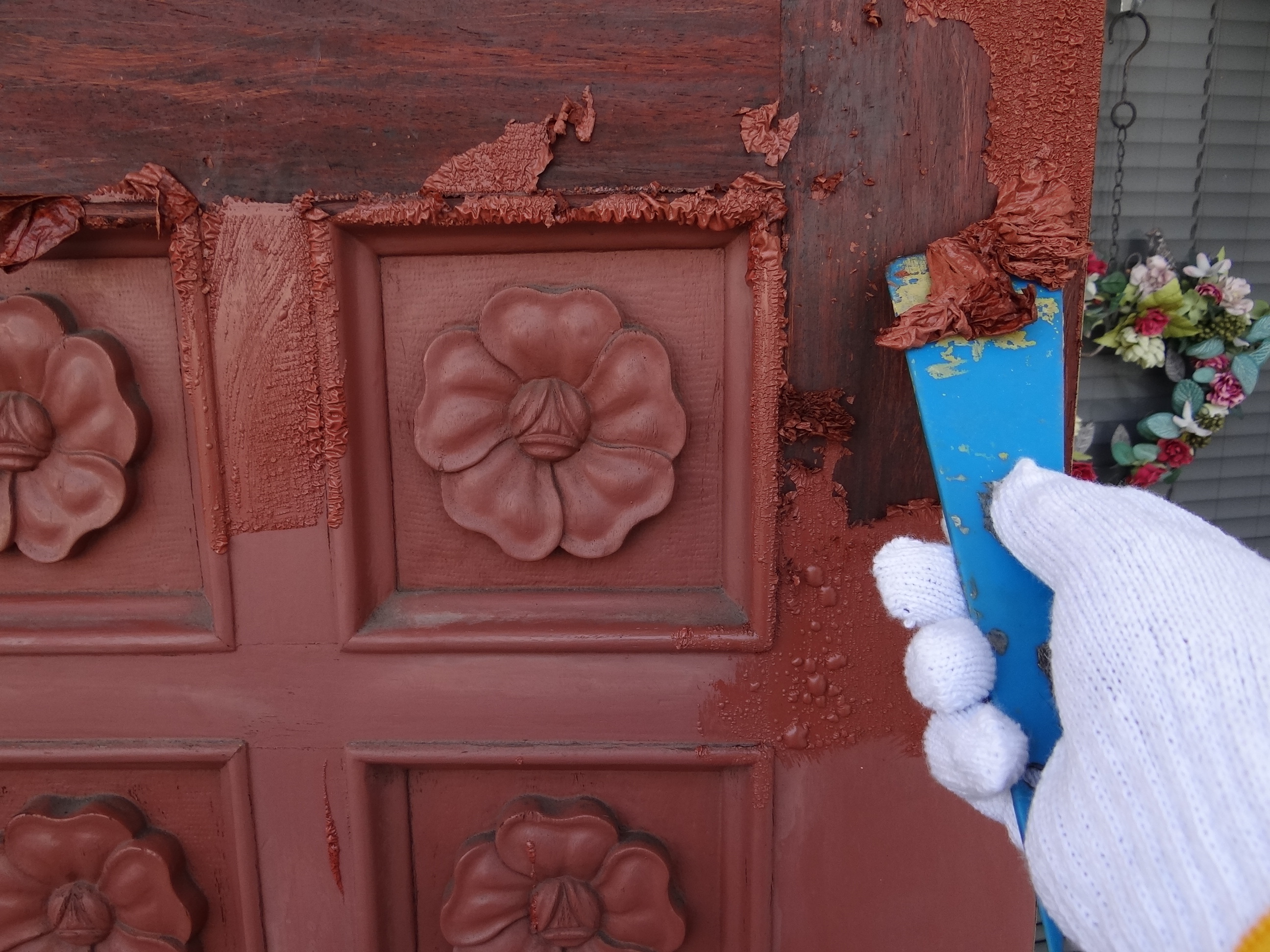 無垢板の玄関ドアですが、ずいぶん前に塗りつぶしたのを、元の木目に戻して欲しいとのご依頼です。なので既設の塗膜を剥離します。