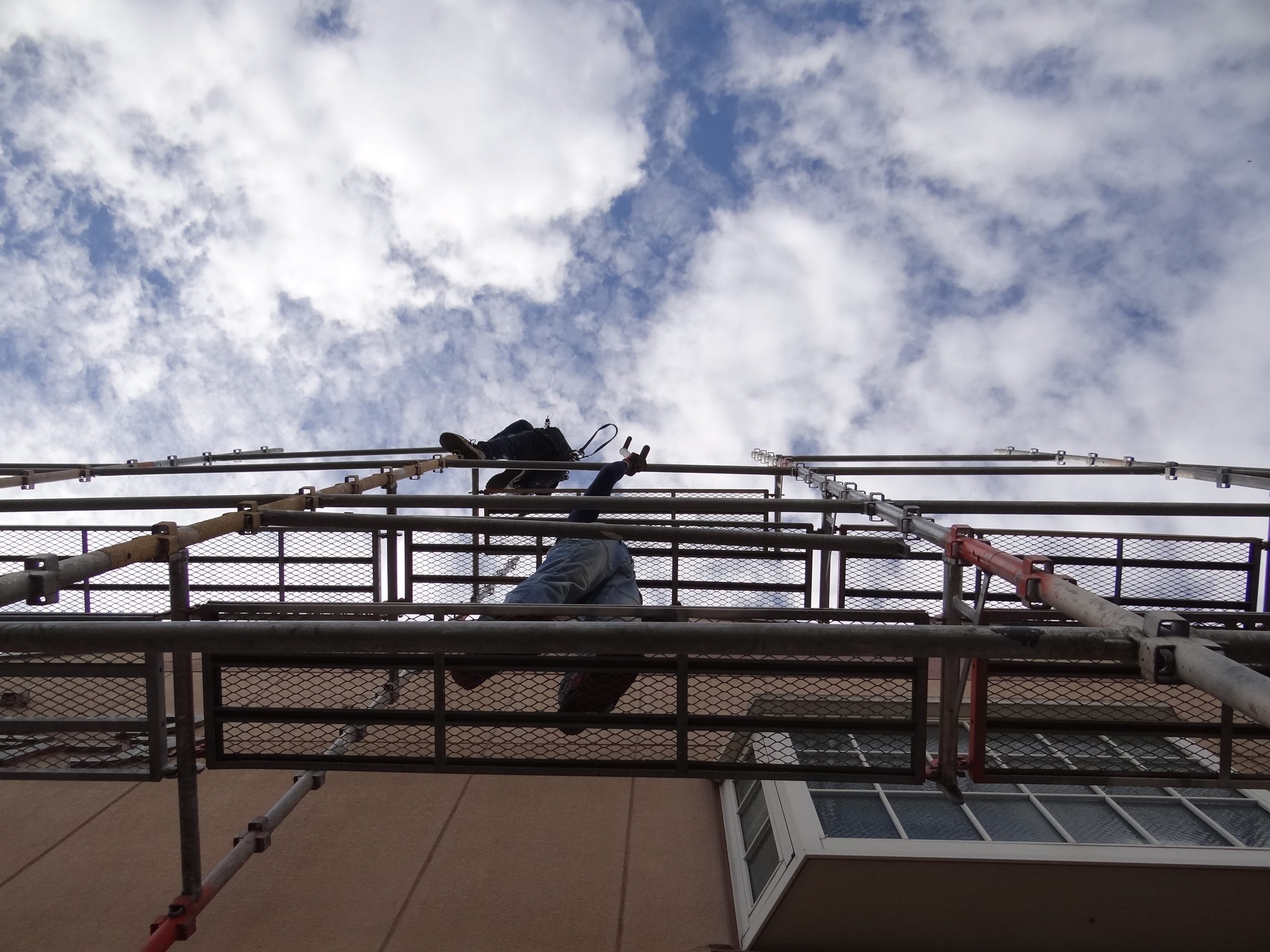 今日から改修工事の始まりです。まずは仮設足場の設営を進めます。