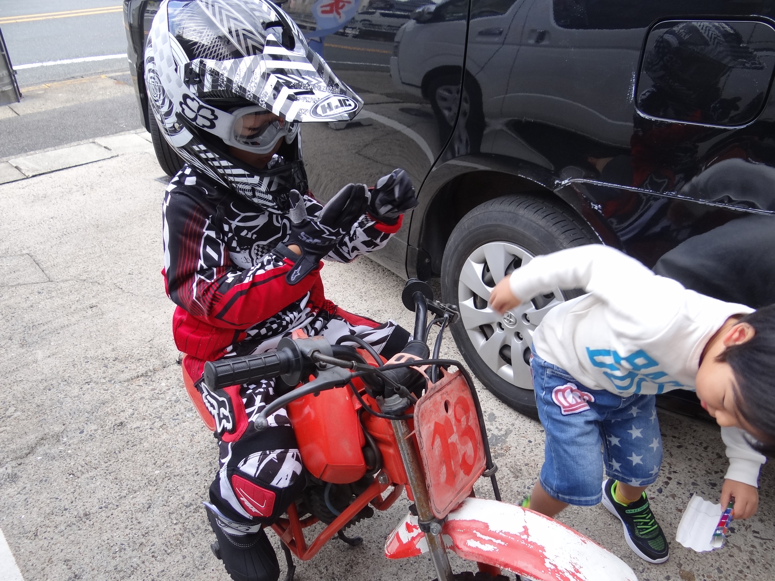 QR50にまたがって操作のお勉強です。まずは走る事より止まる事。