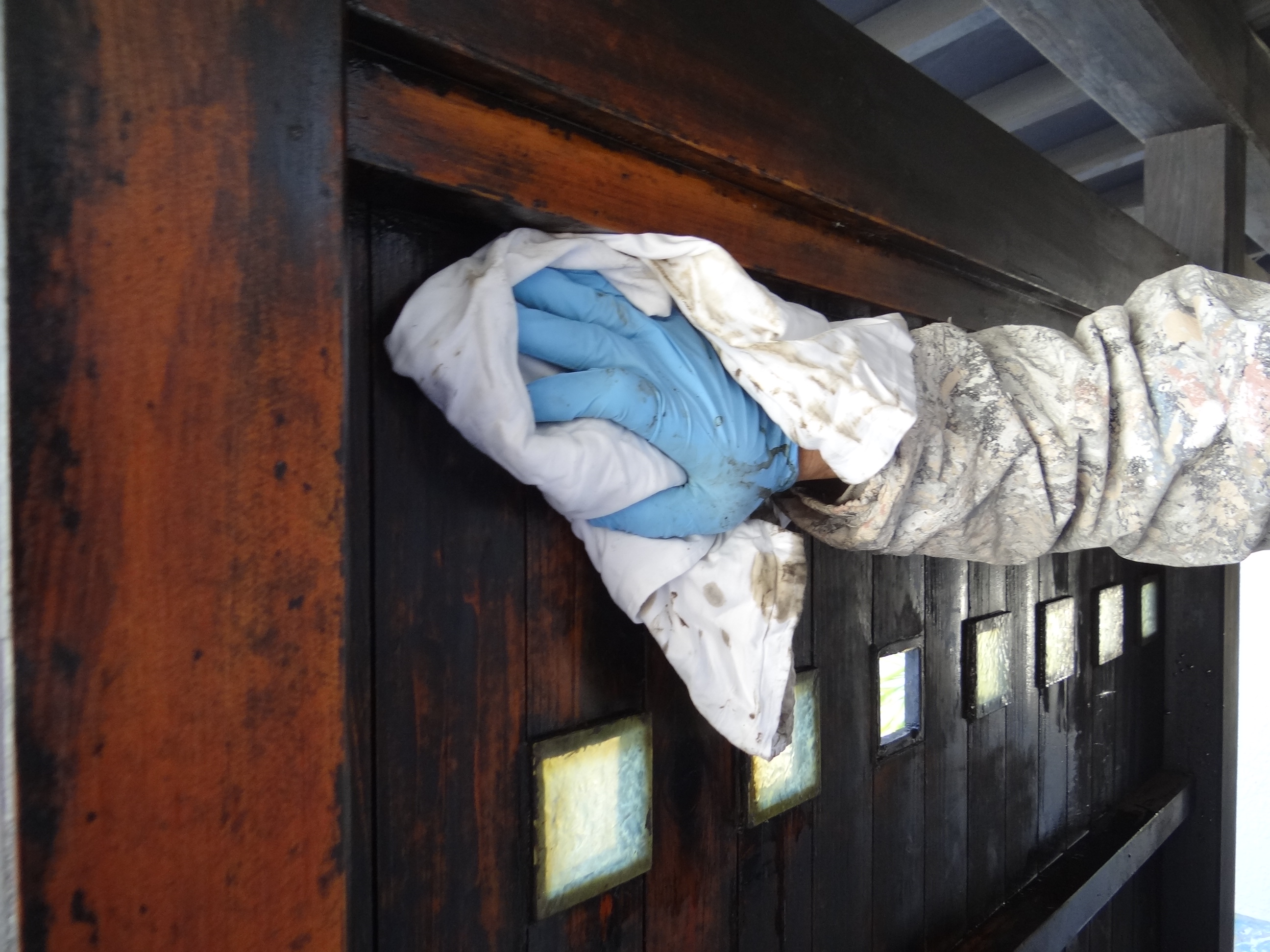 今日は屋根のケレン及び清掃、木部の素地調整、木部の脱脂、洗浄、よーし屋根のプライマー塗布、屋根の中塗り、木部の使用材料キシラデコール。木部の1回目塗布施工中。そんな塗装工事の日でした。