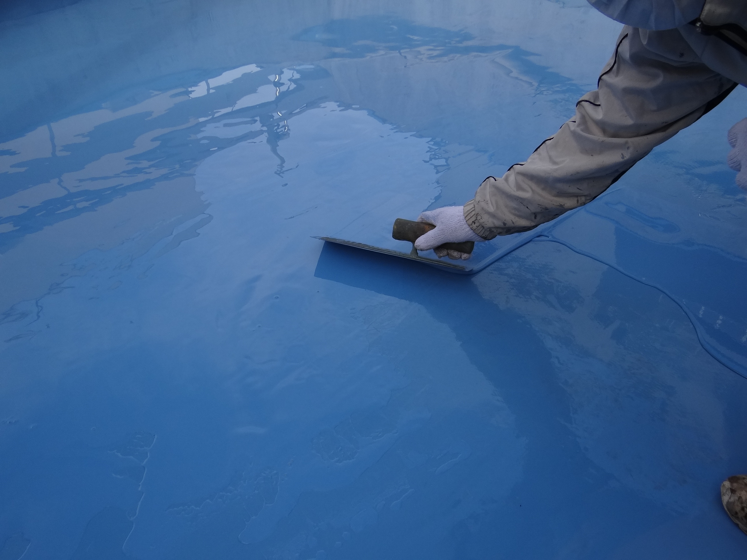 今日はエマルション防水のプライマー塗布。そして昨日の続きでウレタンの2層目を流しました。ウレタンが少し残ったので、トップコートの施工箇所前にコロコロ~と塗布して今日はここまで。