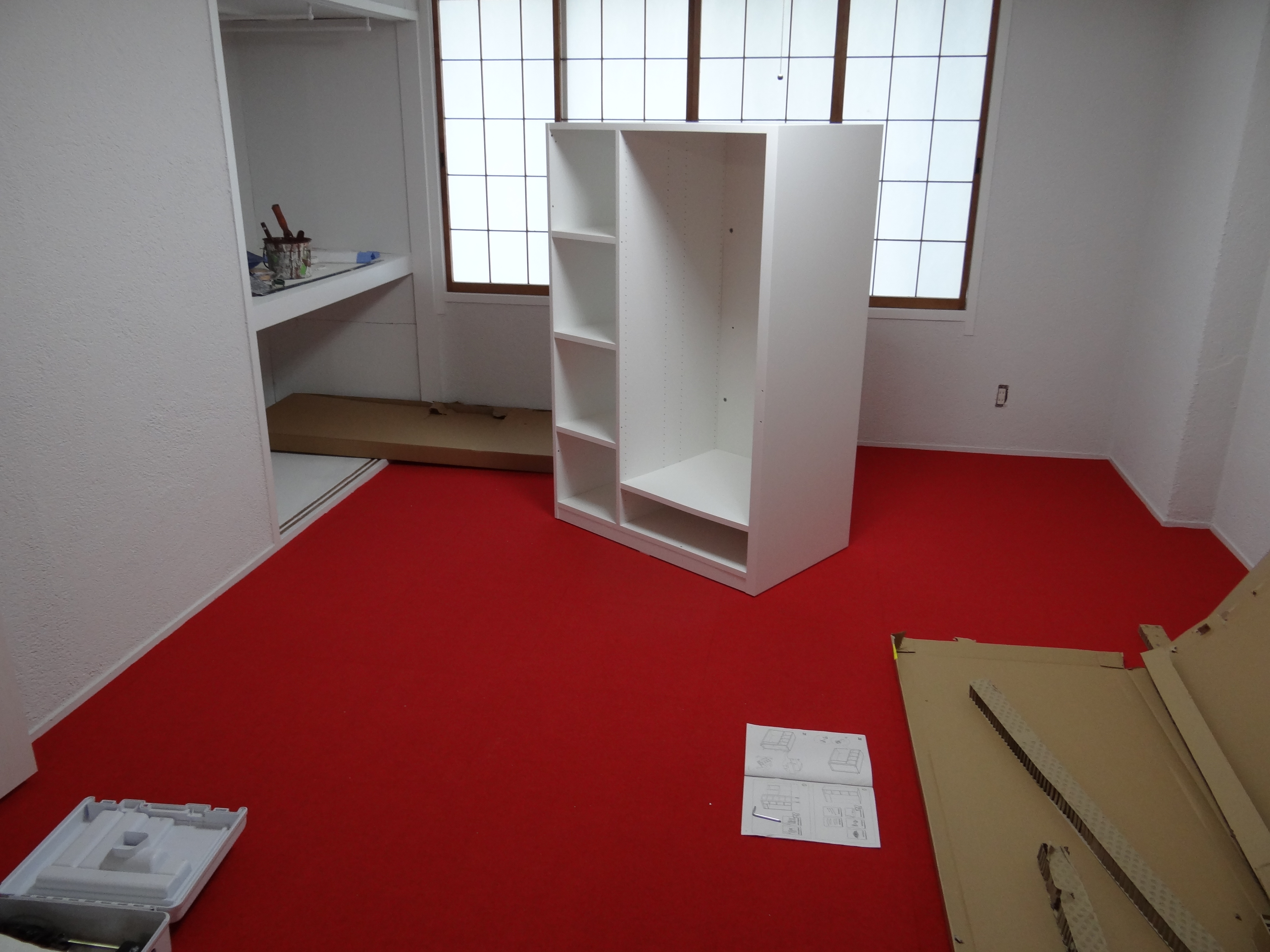帰宅後、子供部屋の家具を組み立てます。なんだか部品がたくさんありますね。説明書をしっかりと読んで組み立てミスをしないよう気を付けます。