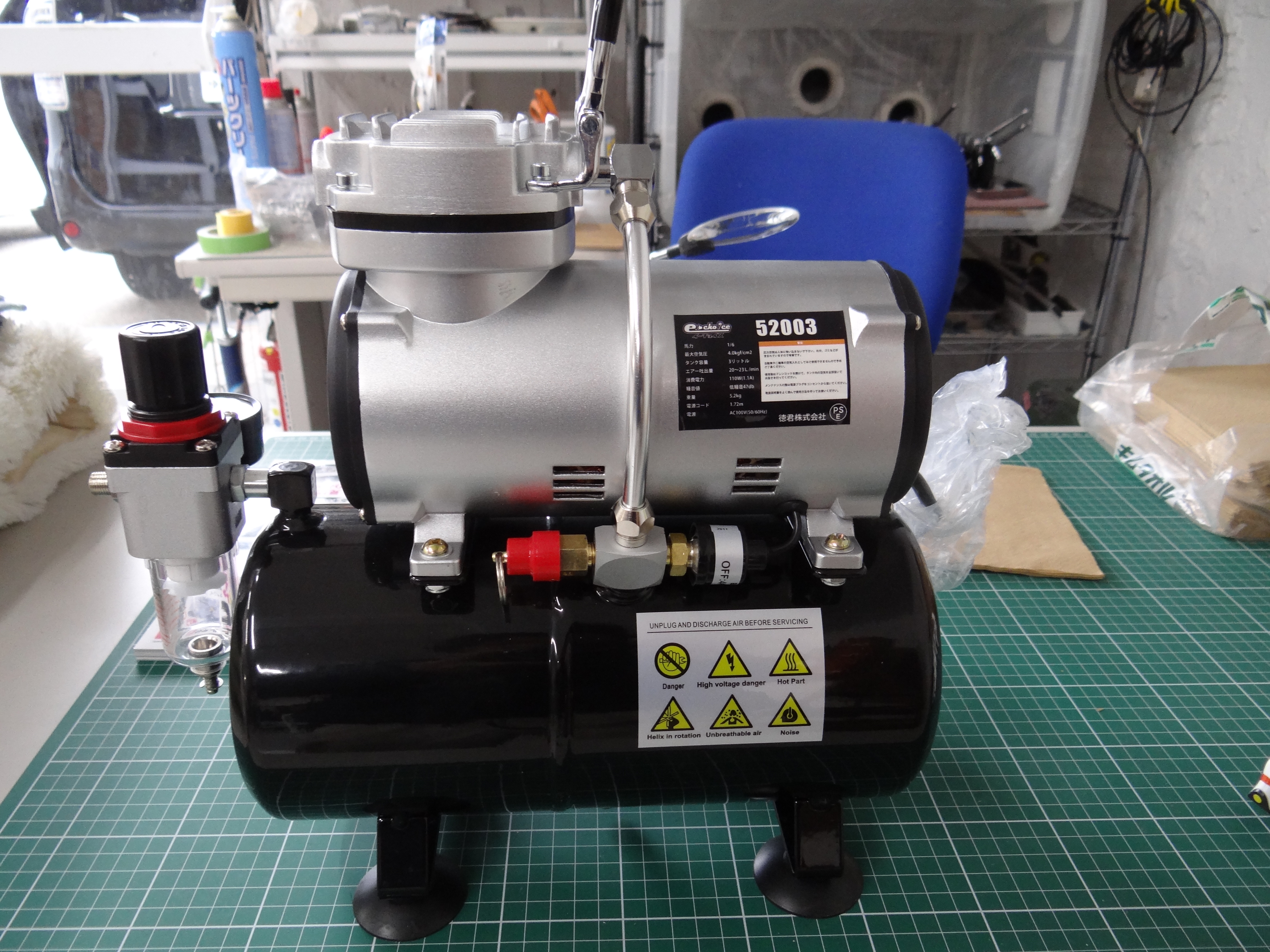 現場でもちょっとした事で活躍するコンプレッサー。ずいぶん長い付き合いです。最近は、ほとんどプラモデルや小物の塗装でしか使わなくなりました。