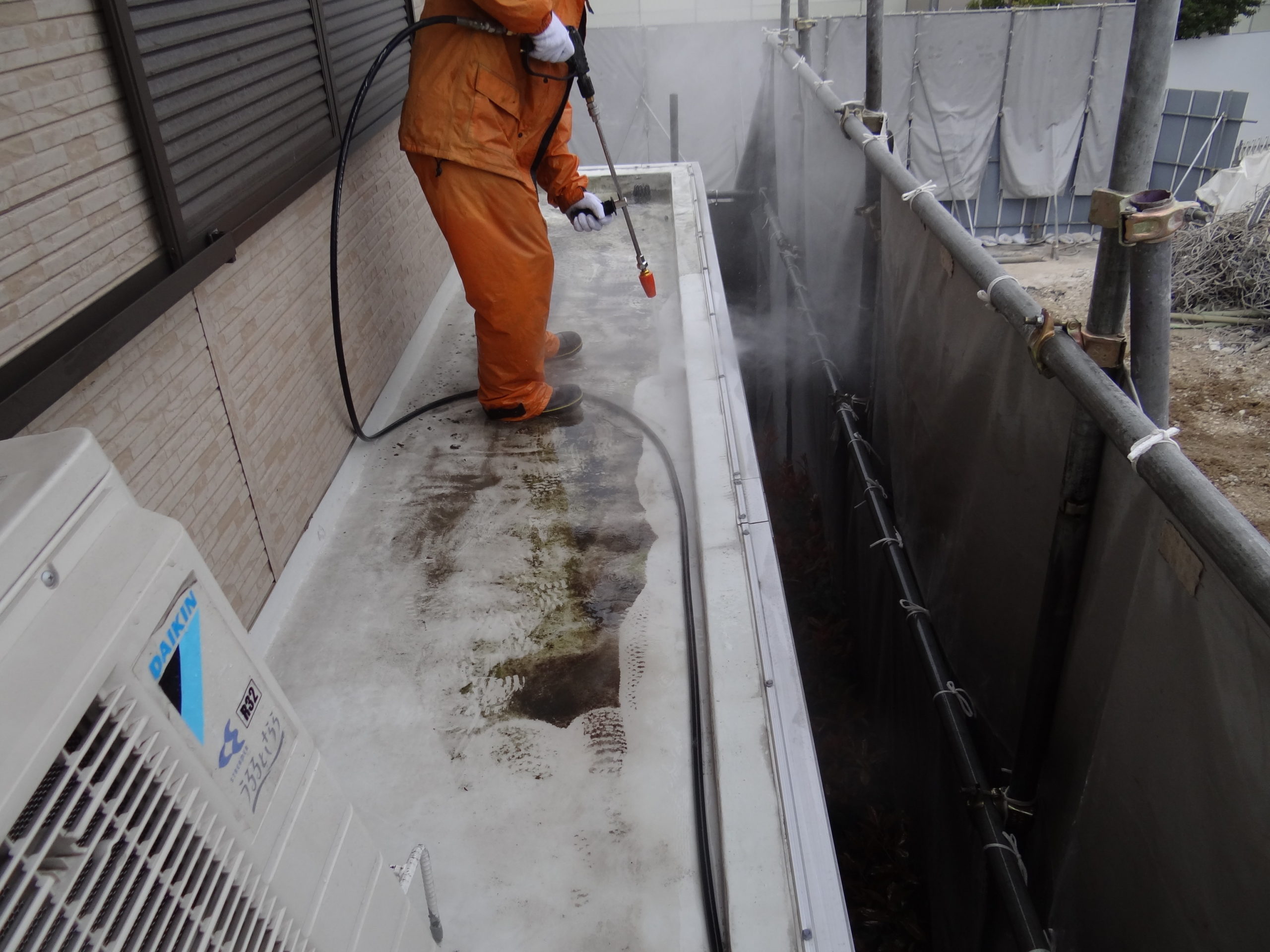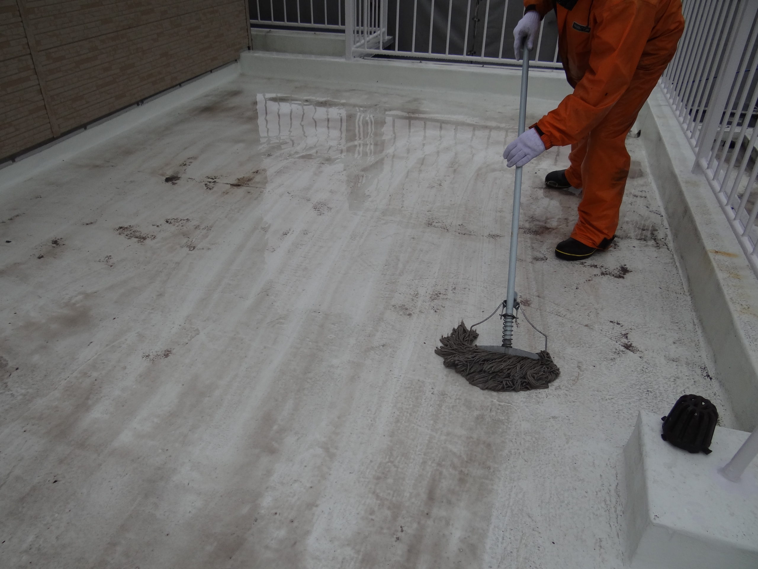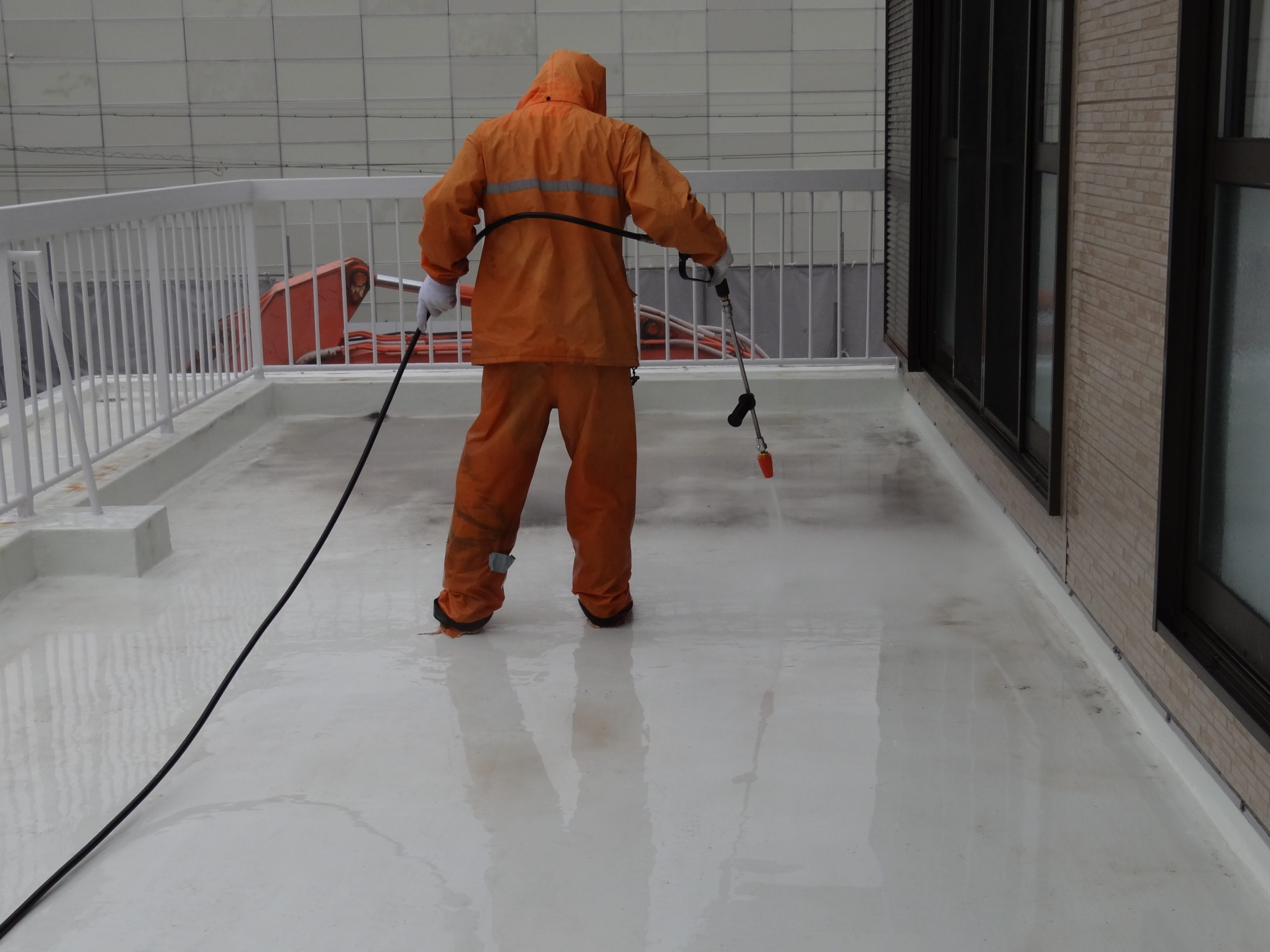 今日は天気予報通りの雨。予定通り高圧洗浄を行いました。まずは清掃から。洗浄開始。モップも併用してゴシゴシと。雨戸や網戸も洗浄。そしてキレイに洗浄完了。さー明日はトップコートを行います。
