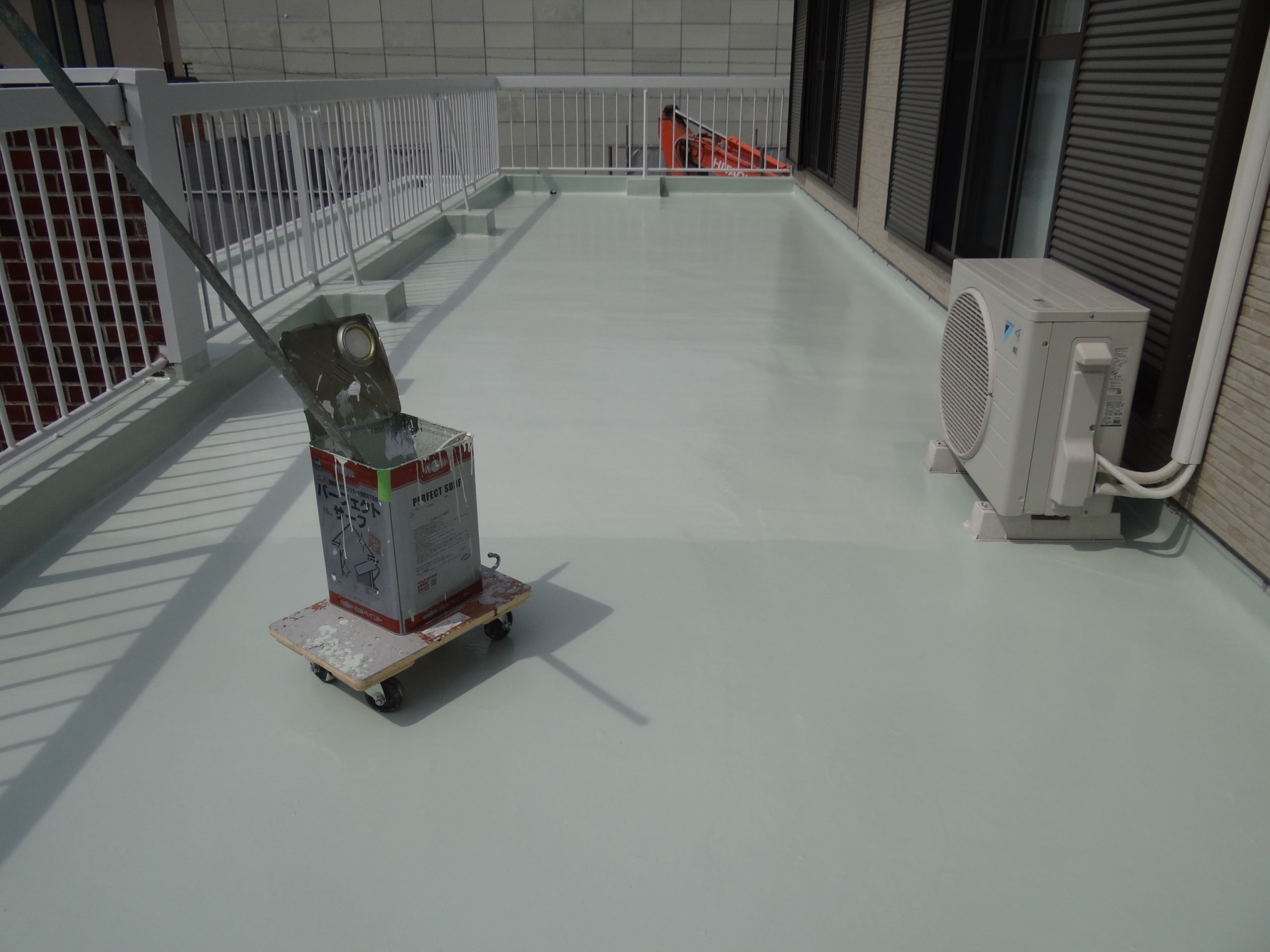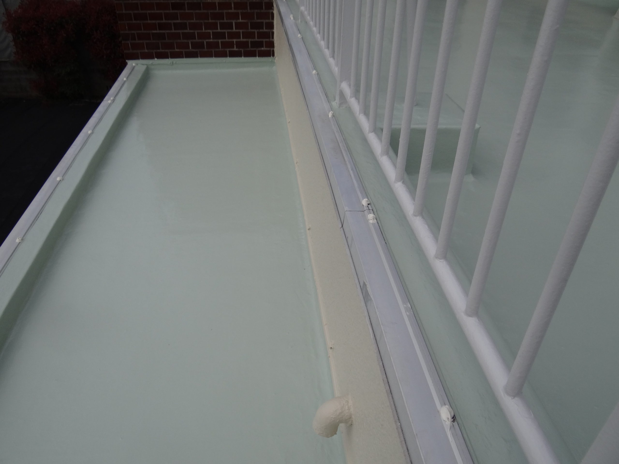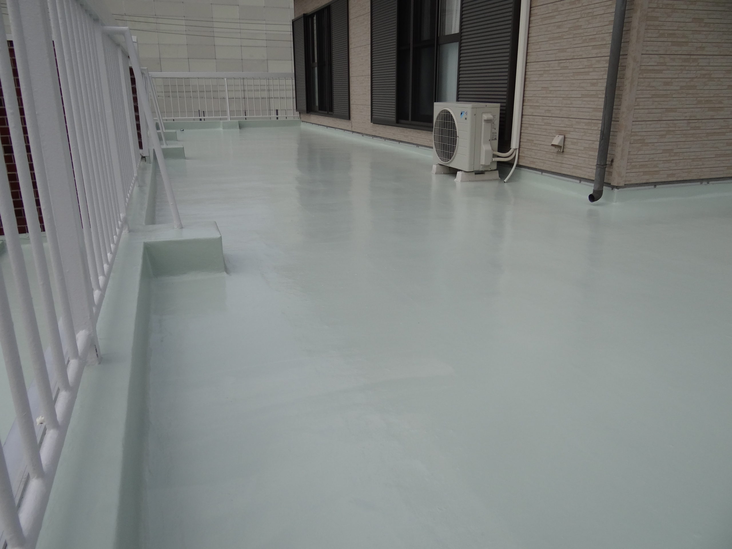 上塗りを2回塗りこれで今回の手摺塗装・ベランダ土間塗装工事は施工完了になりました。