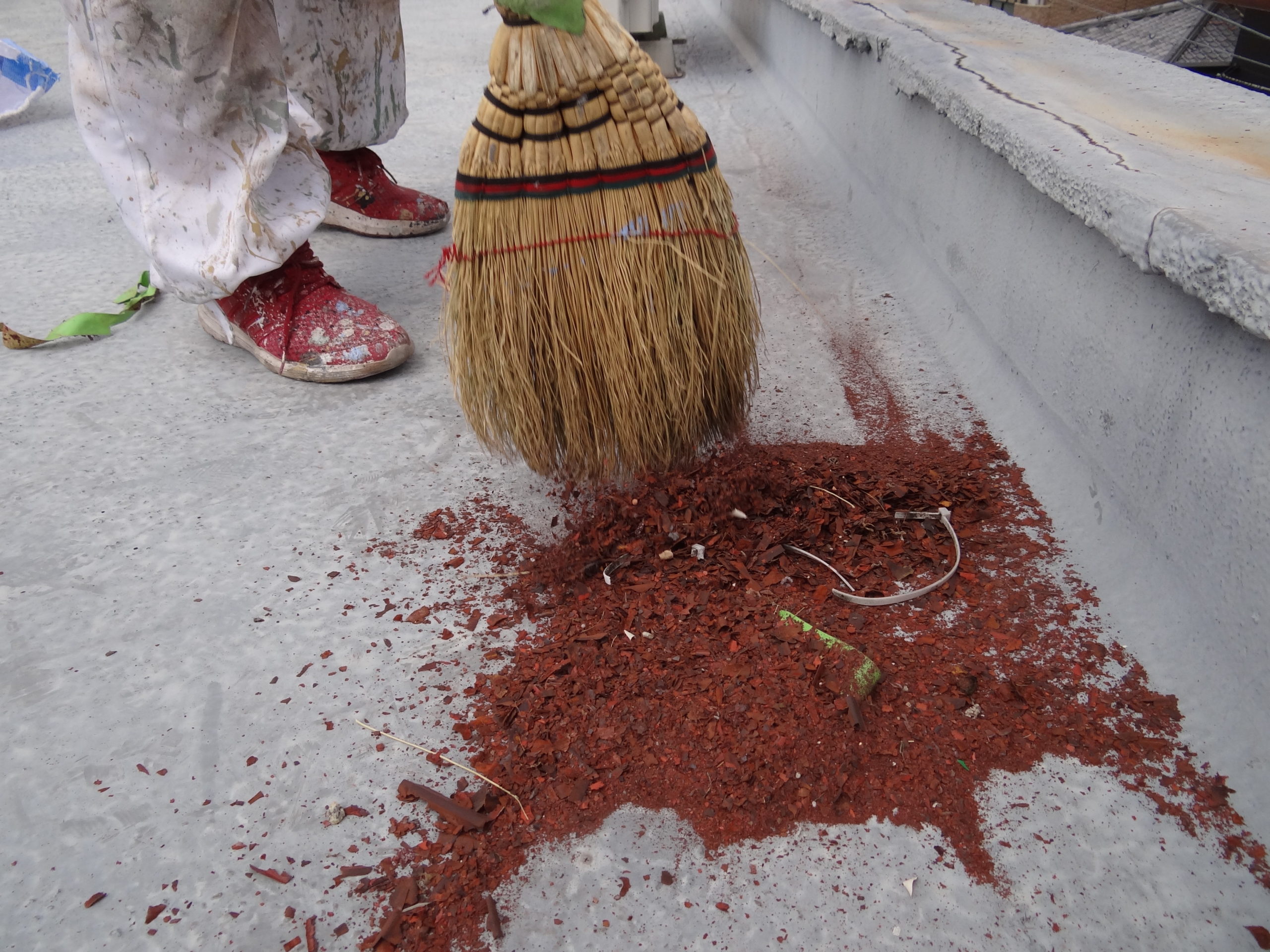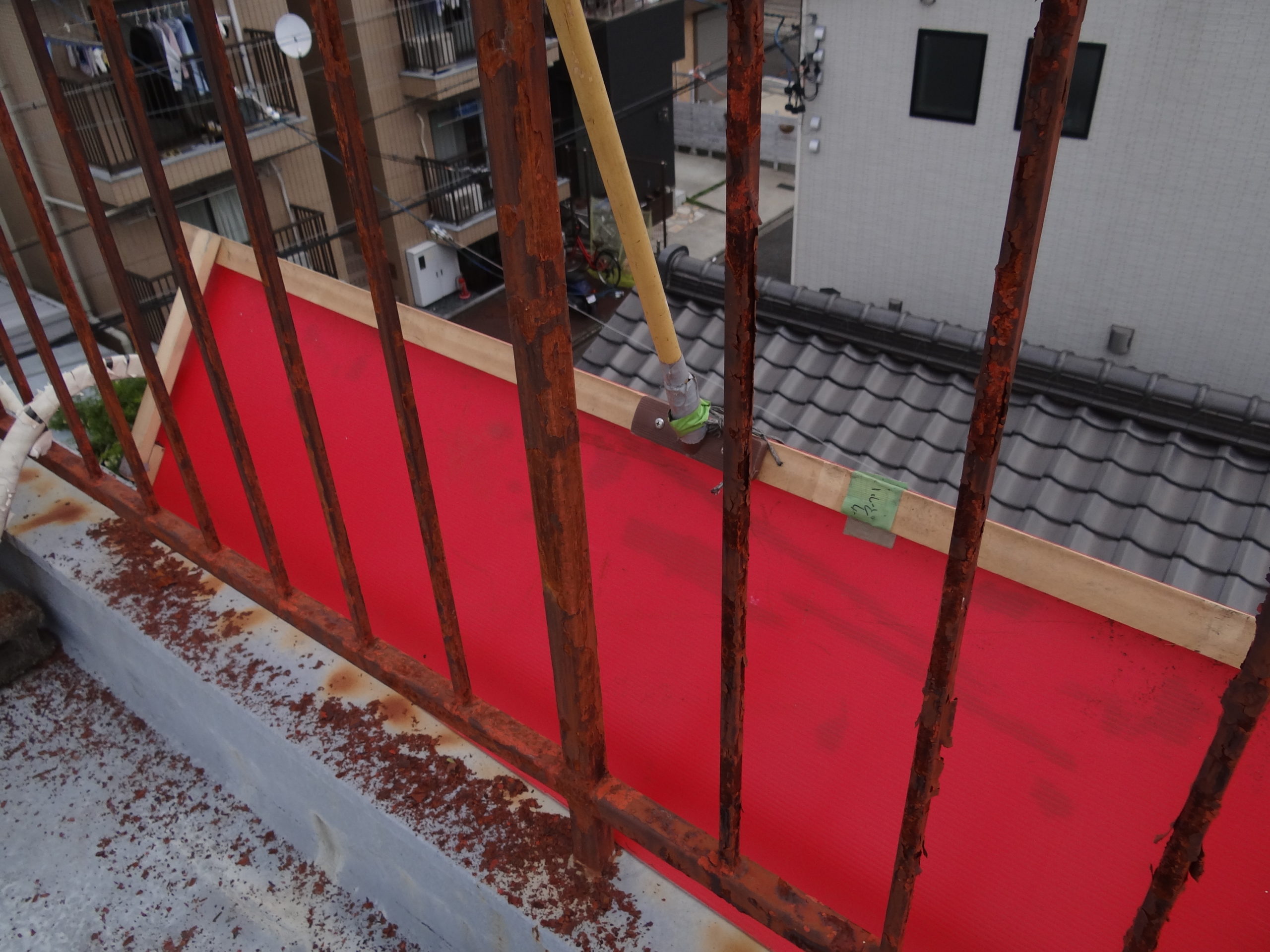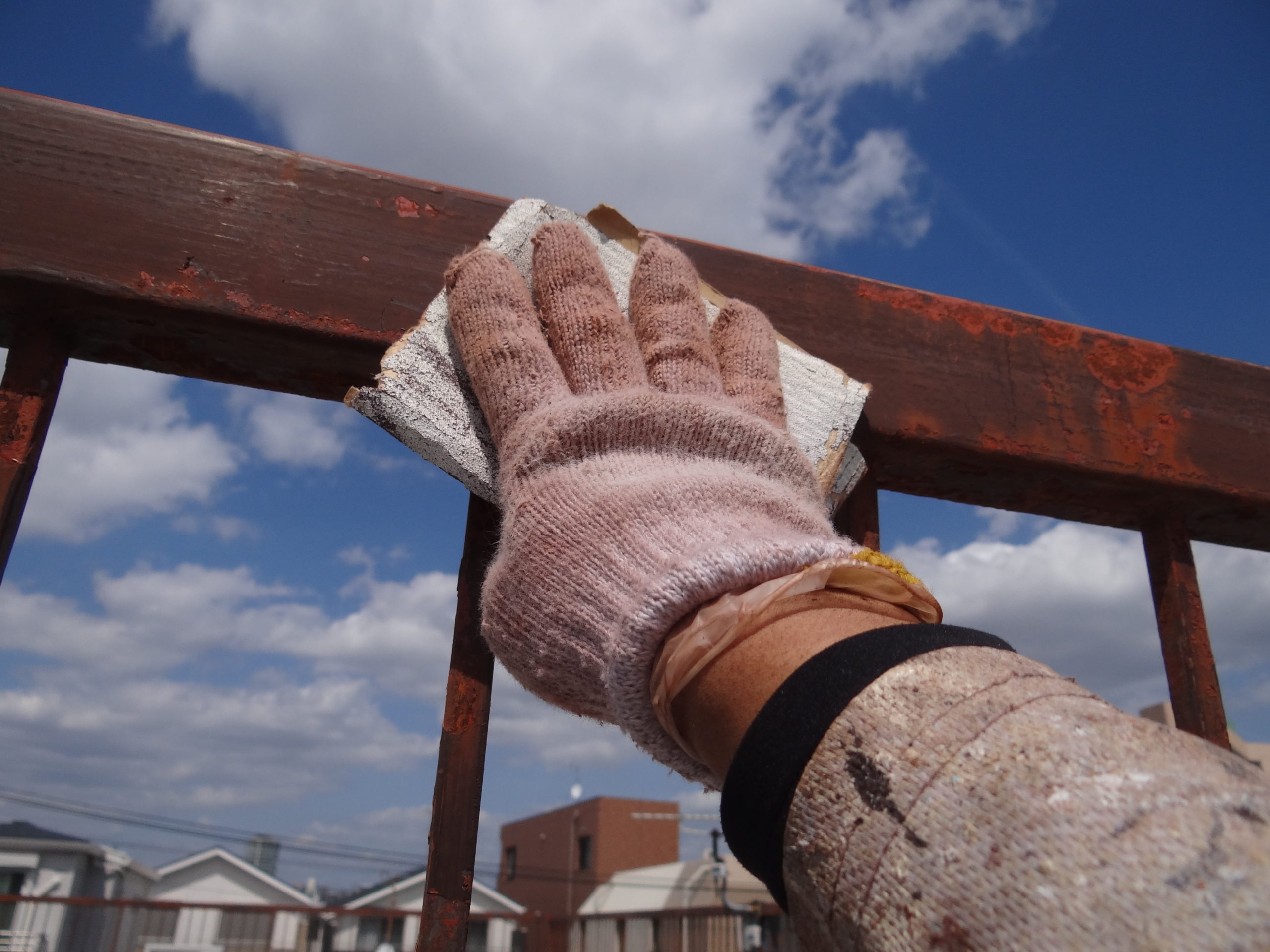 今日から手摺の塗装工事を始めました。まずは剥離した塗膜などを、