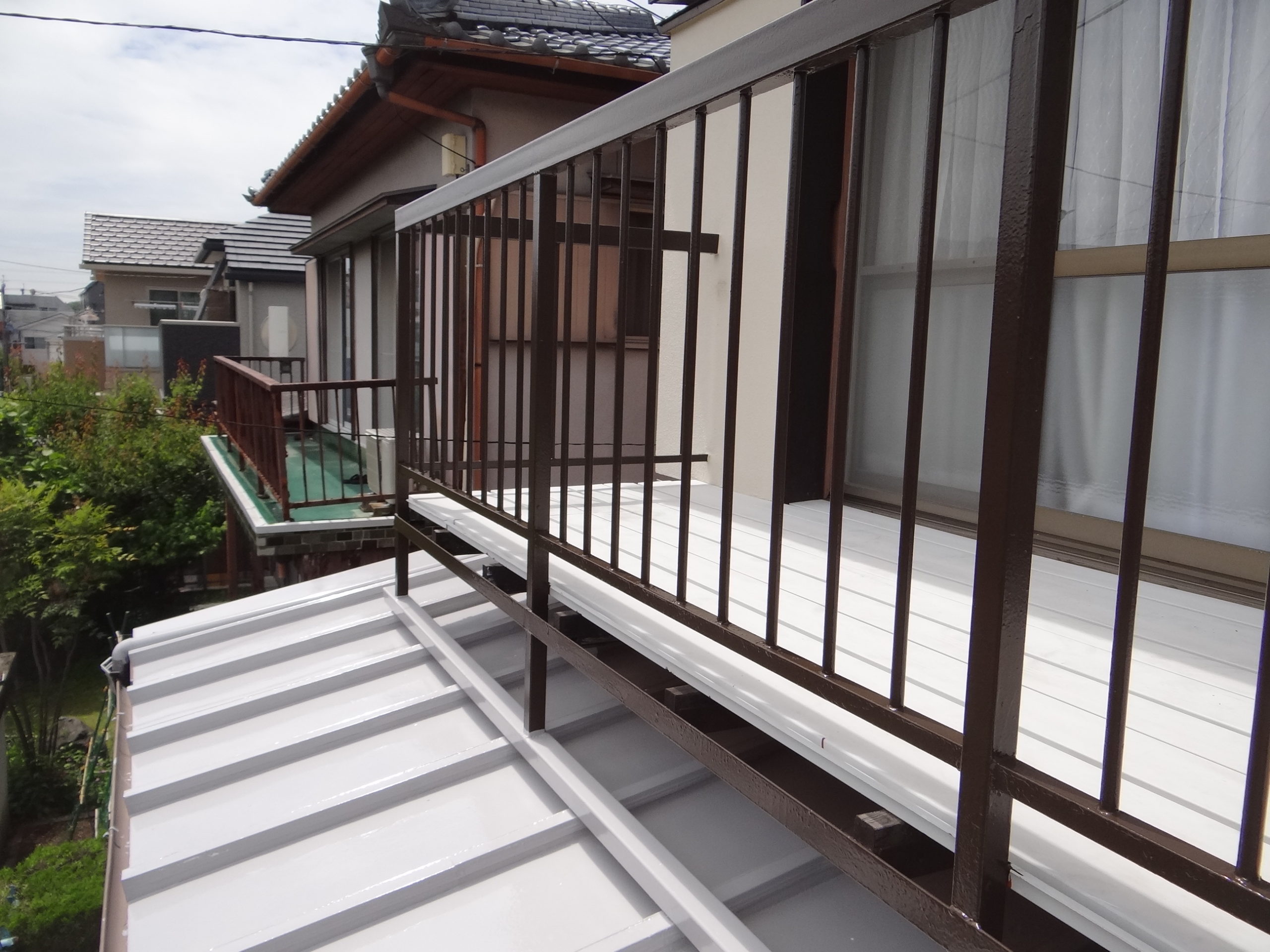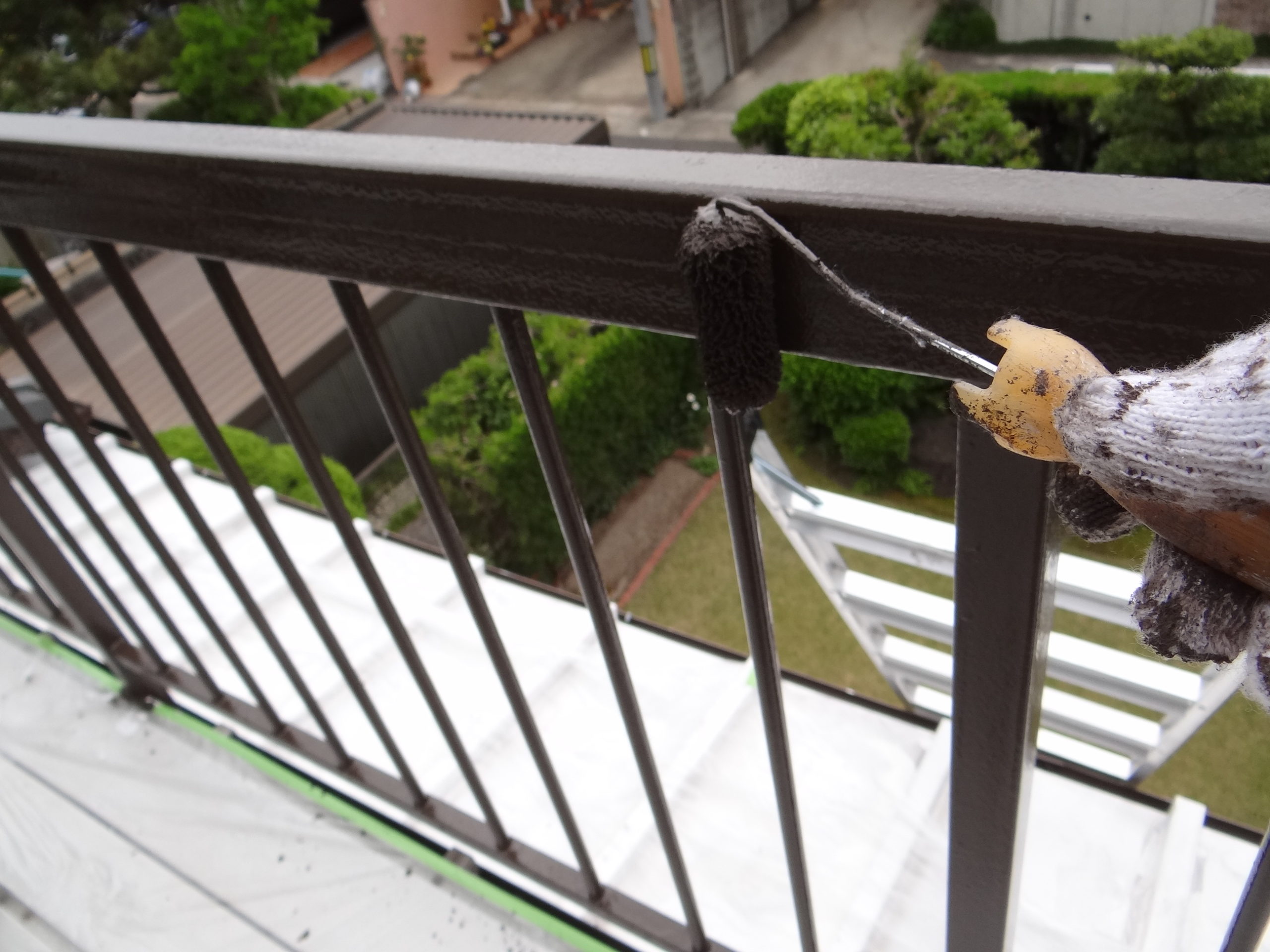 昨日の続きで手摺の塗装です。中塗り施工中。