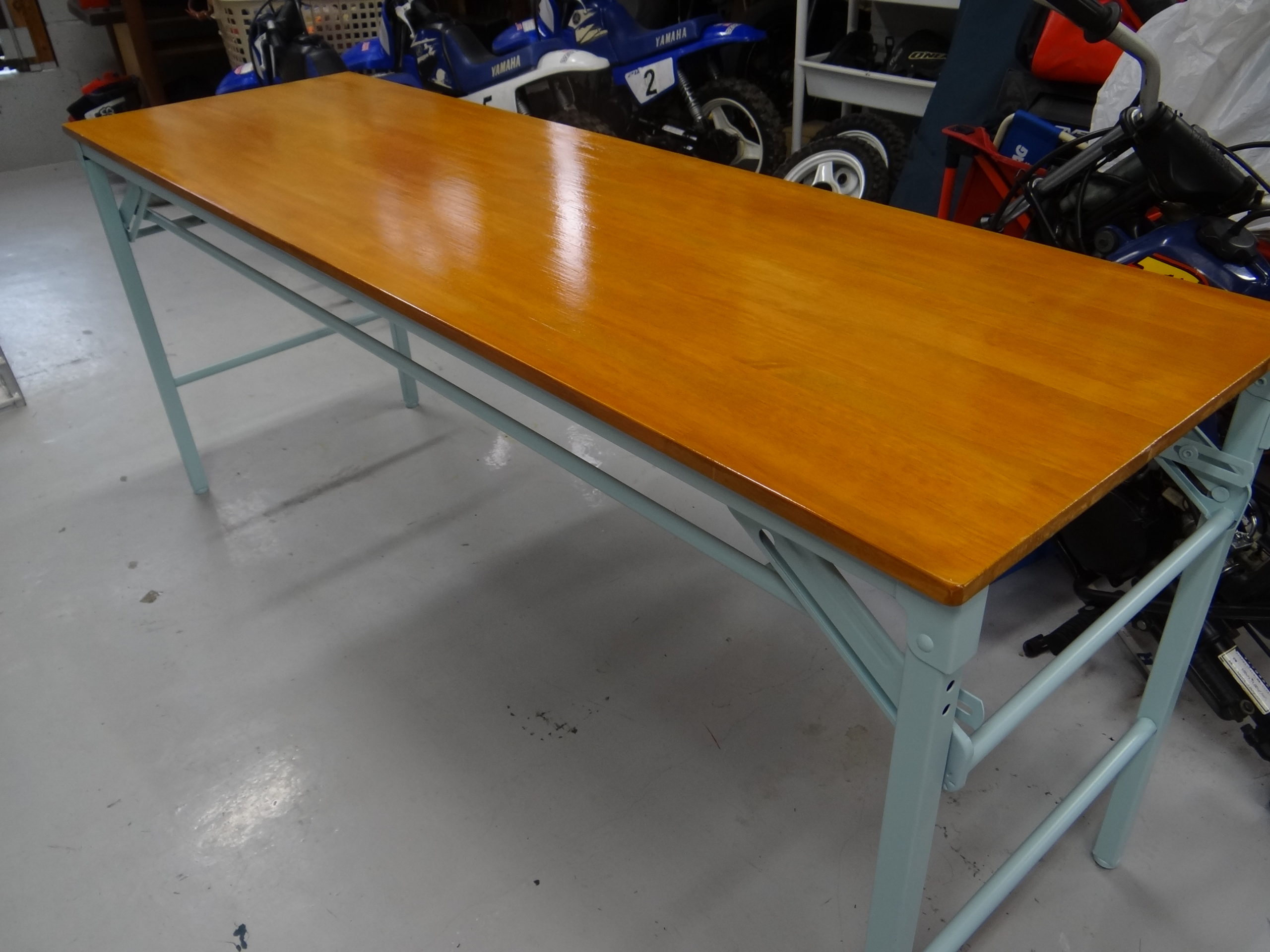 今日は仮設足場の解体を行いました。そして安全に施工完了いたしました。折りたたみ事務机の天板を交換して塗装です。天板は短くカットして軽くなったので持ち運びが楽になりました。