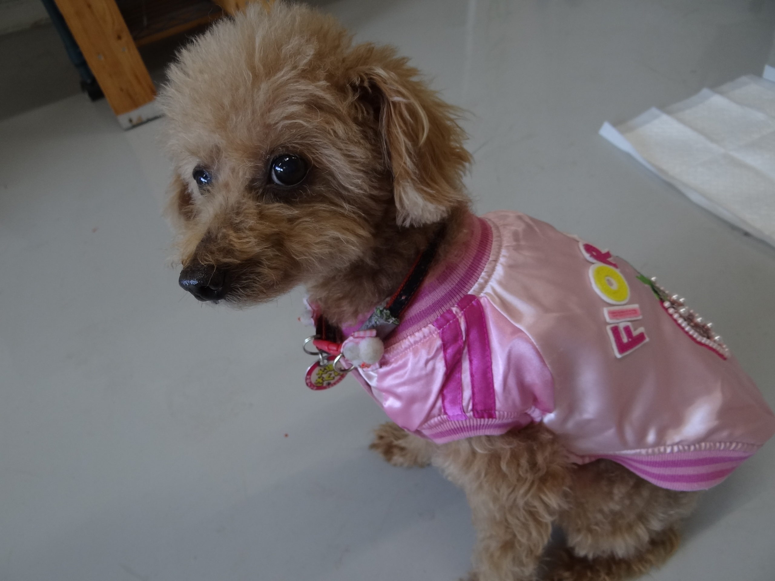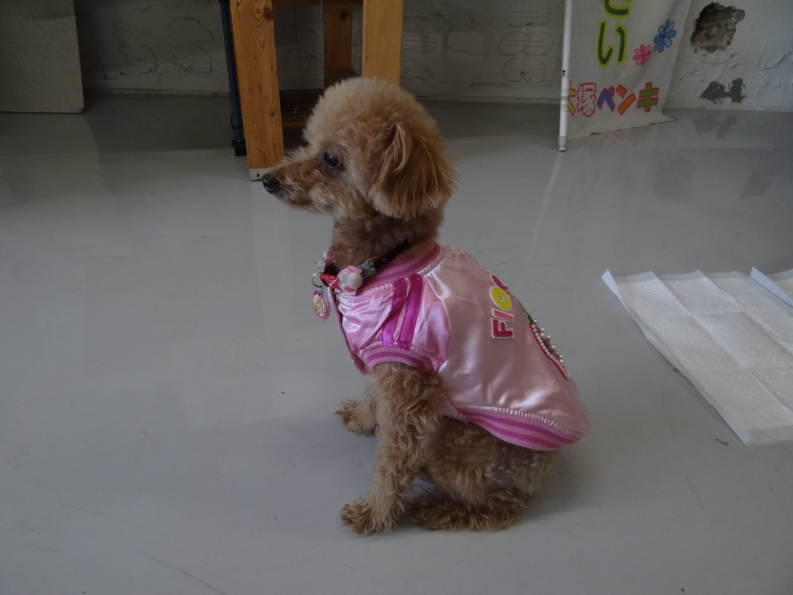 御施主様からお犬さんの洋服をいただきました。ありがとうございます。早速、着せて記念写真をハイポーズ!ぜーんぜん、こっちを向いてくれません。。
