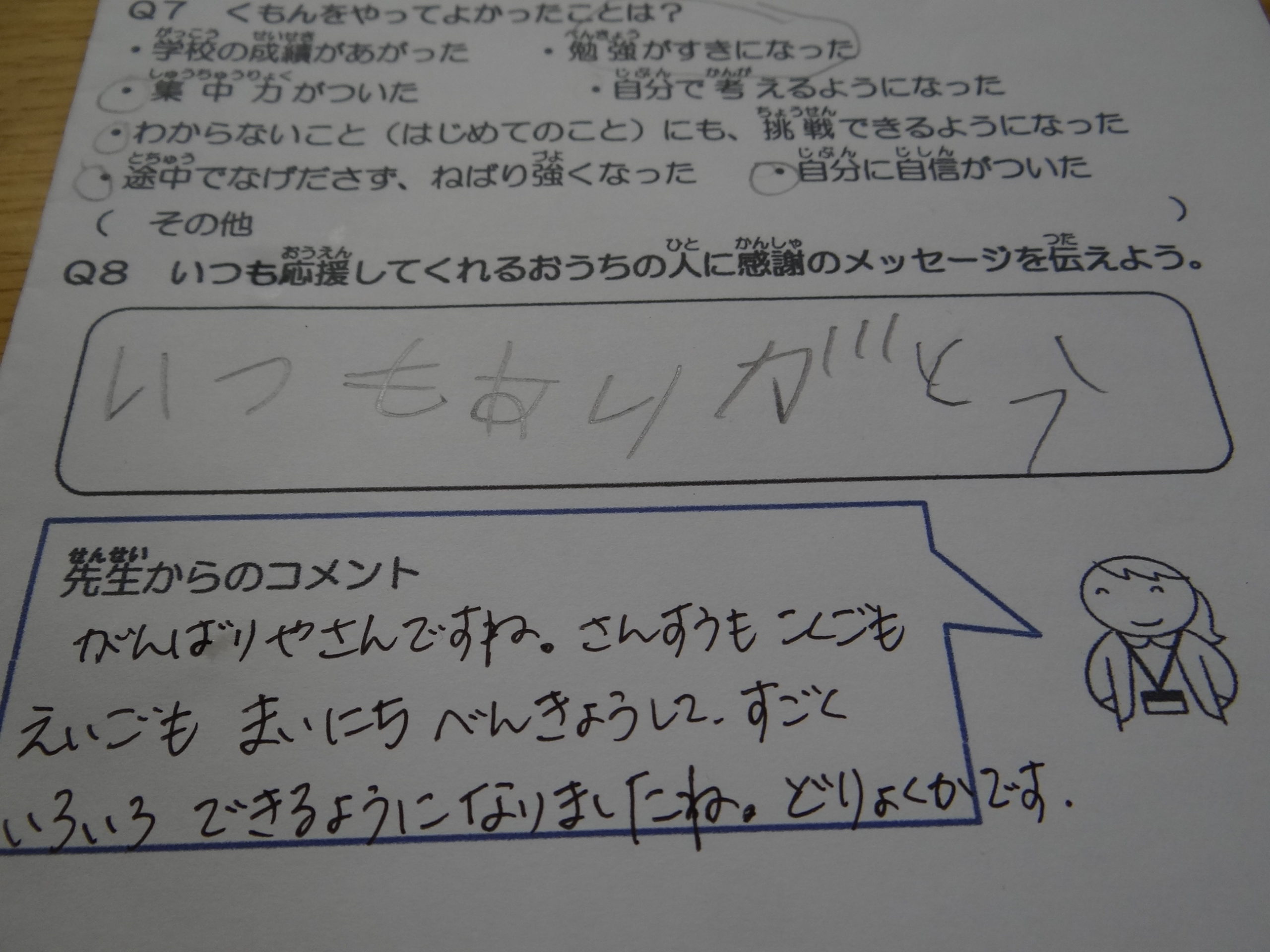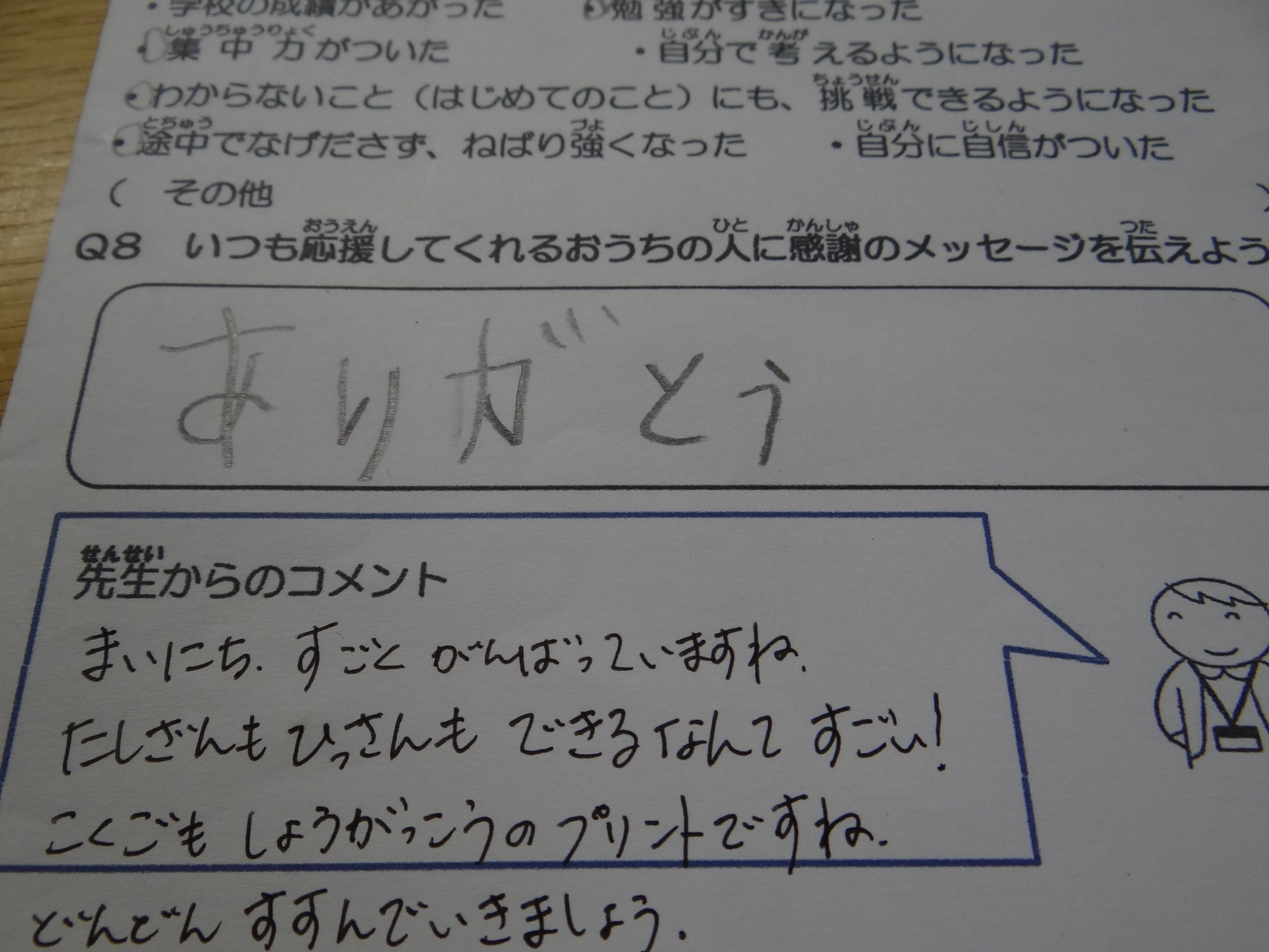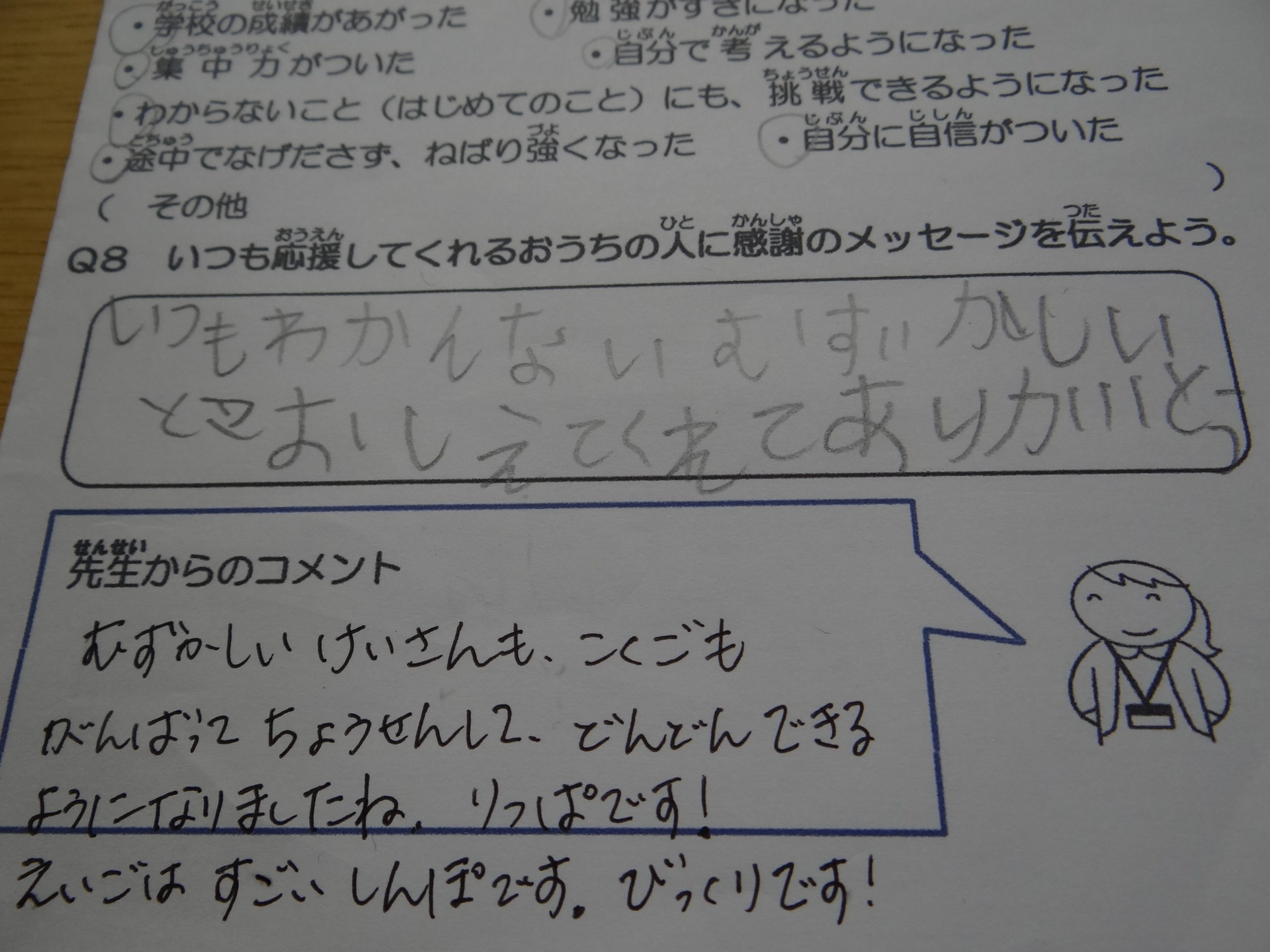 三男のアンケート用紙。ありがとう、なんだか嬉しかった。先生のコメントは、褒めてほめて魔法をかけてくれているんだな~と思います。ありがとうございました。