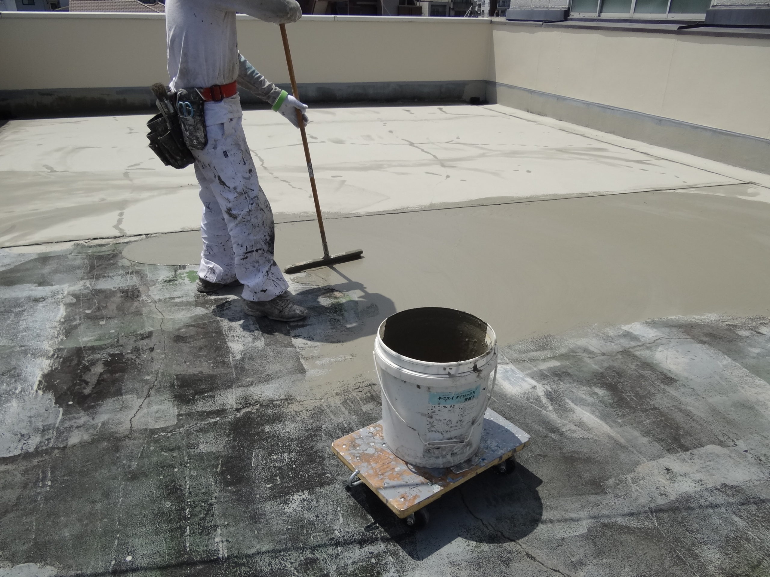 今日の防水工事は既存目地材の撤去、腰壁の塗装、ノロ引き、改修ドレン設置、目地パス取付、材料荷揚げ、などなど。。。よーし今日の目標達成。これで明日はチビ達のバイクデーです。
