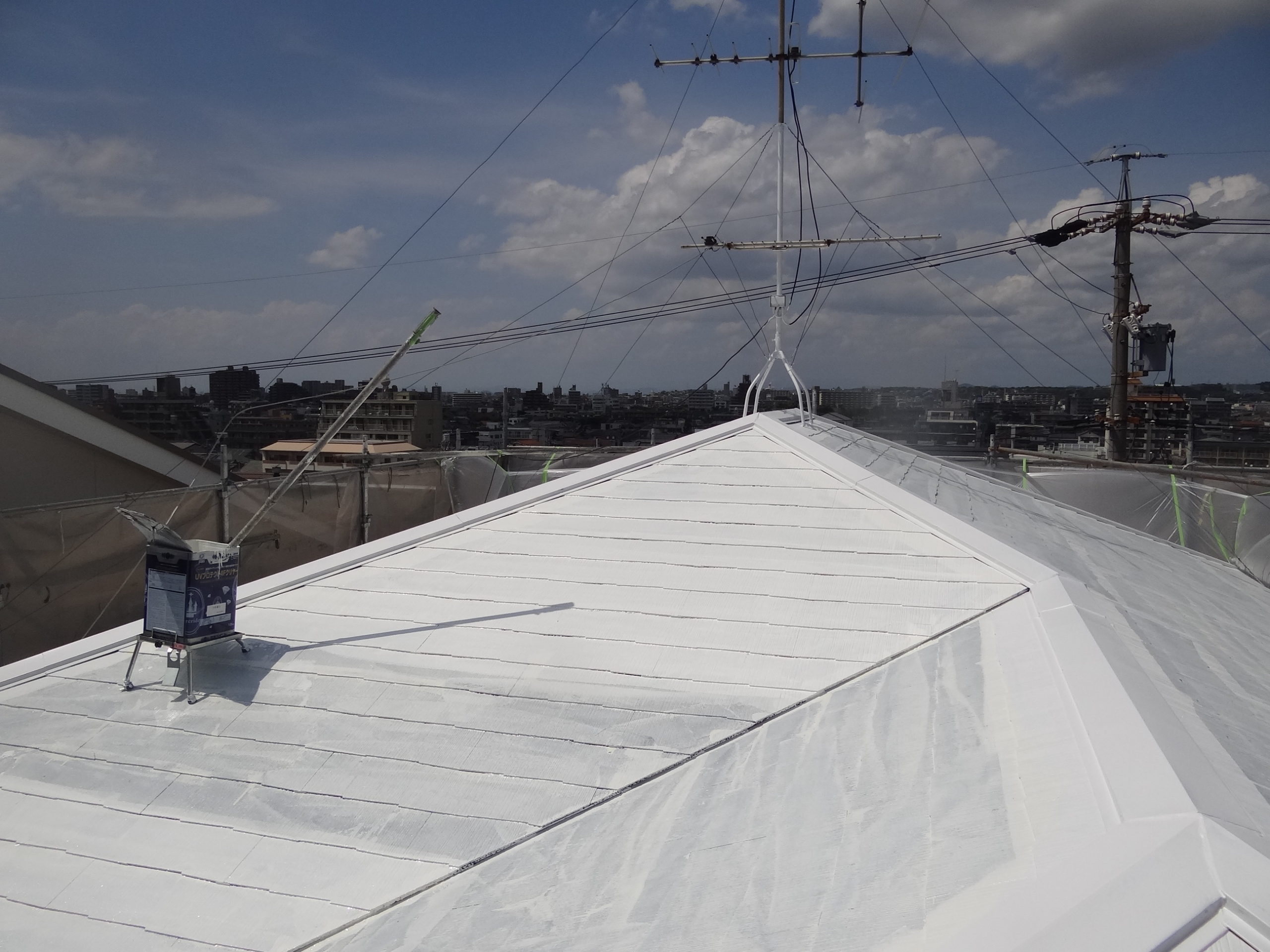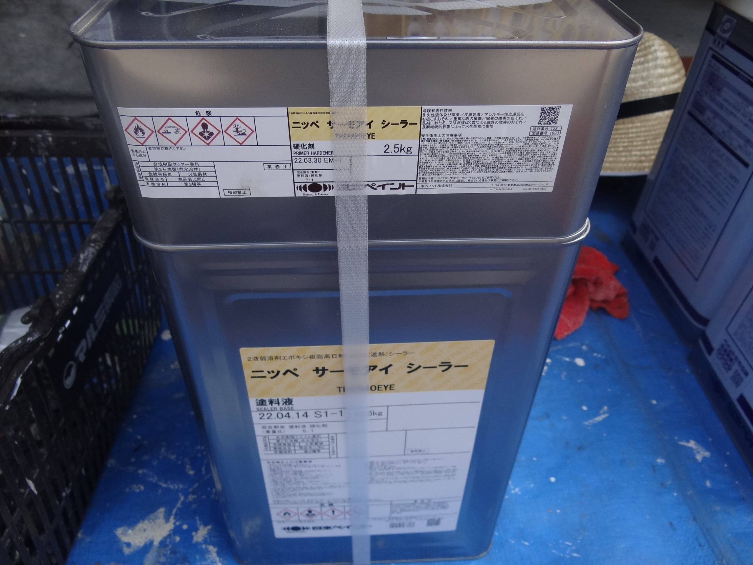 旧塗膜が張り付いているので、カラーベストの縁切り。タスペーサーを設置。今回使用する下塗り材。下塗り1回目塗布施工中。乾燥後、下塗り2回目塗布施工中。そんな感じで順調に施工を進めていた日です。