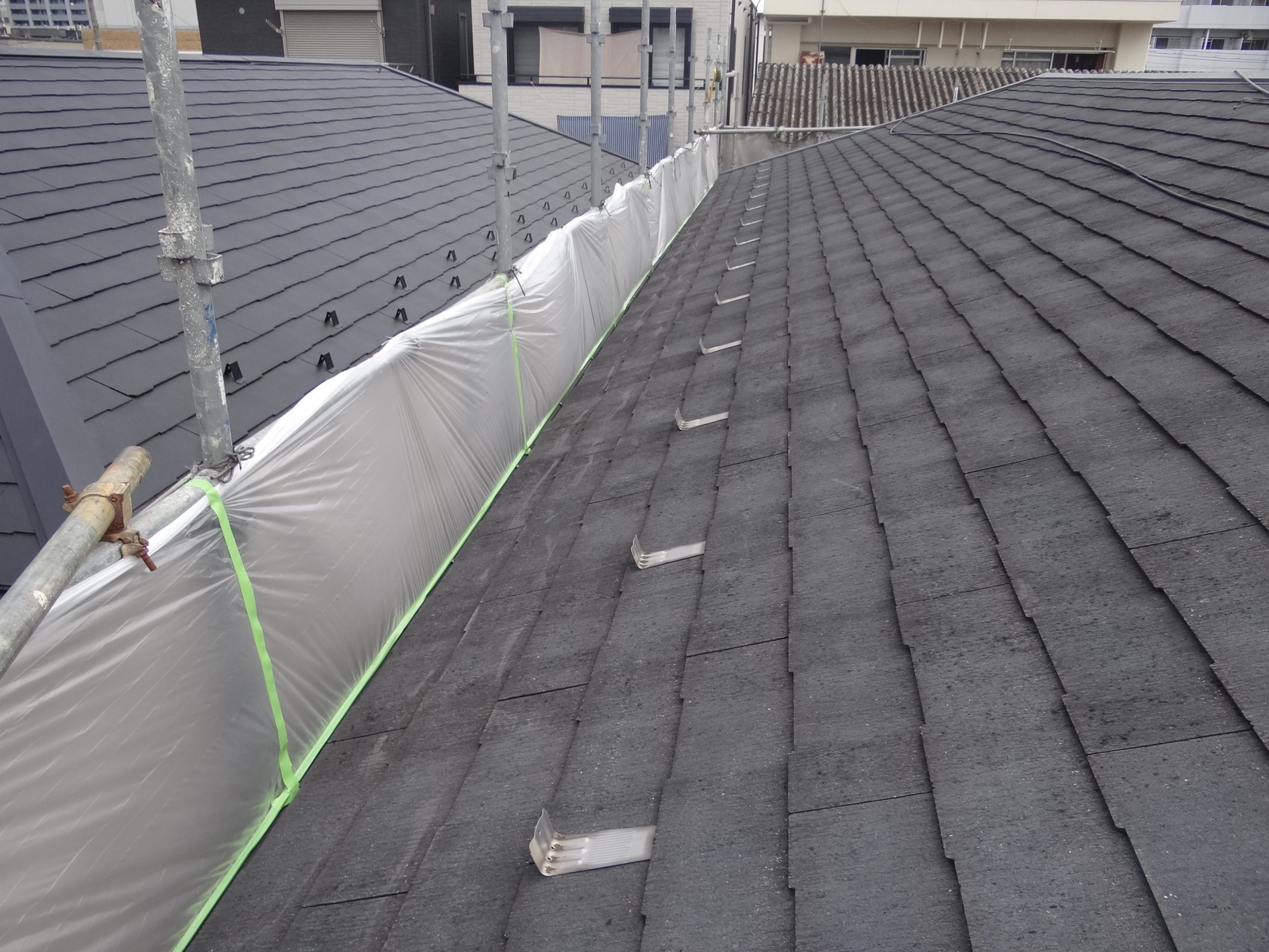 今日は高圧洗浄を行いました。まずはカラーベスト屋根の洗浄から。お隣様が隣接しているので、水しぶきが飛ばないよう養生を行います。施工中。そしてバッチリ、洗浄完了です。