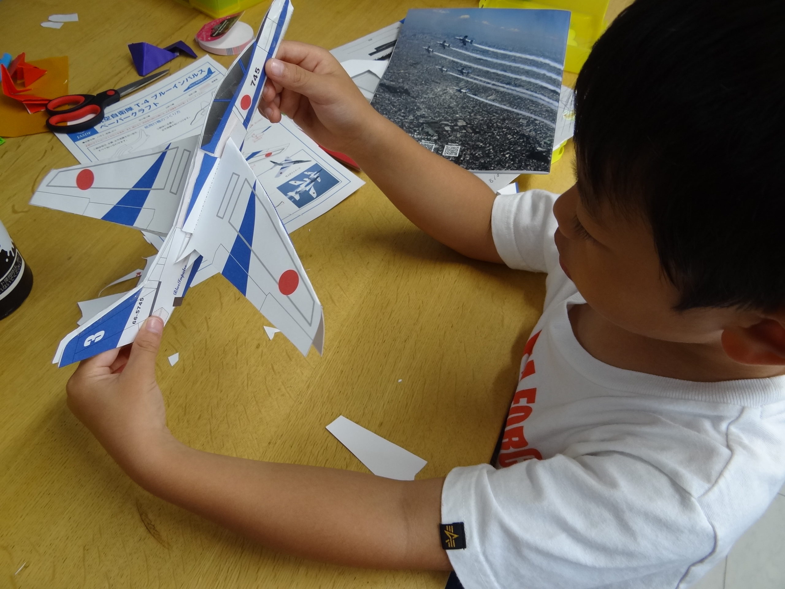 この前、エアーパークに行った時にいただいたブルーインパルスのペーパークラフトをチョキチョキしながら制作中。