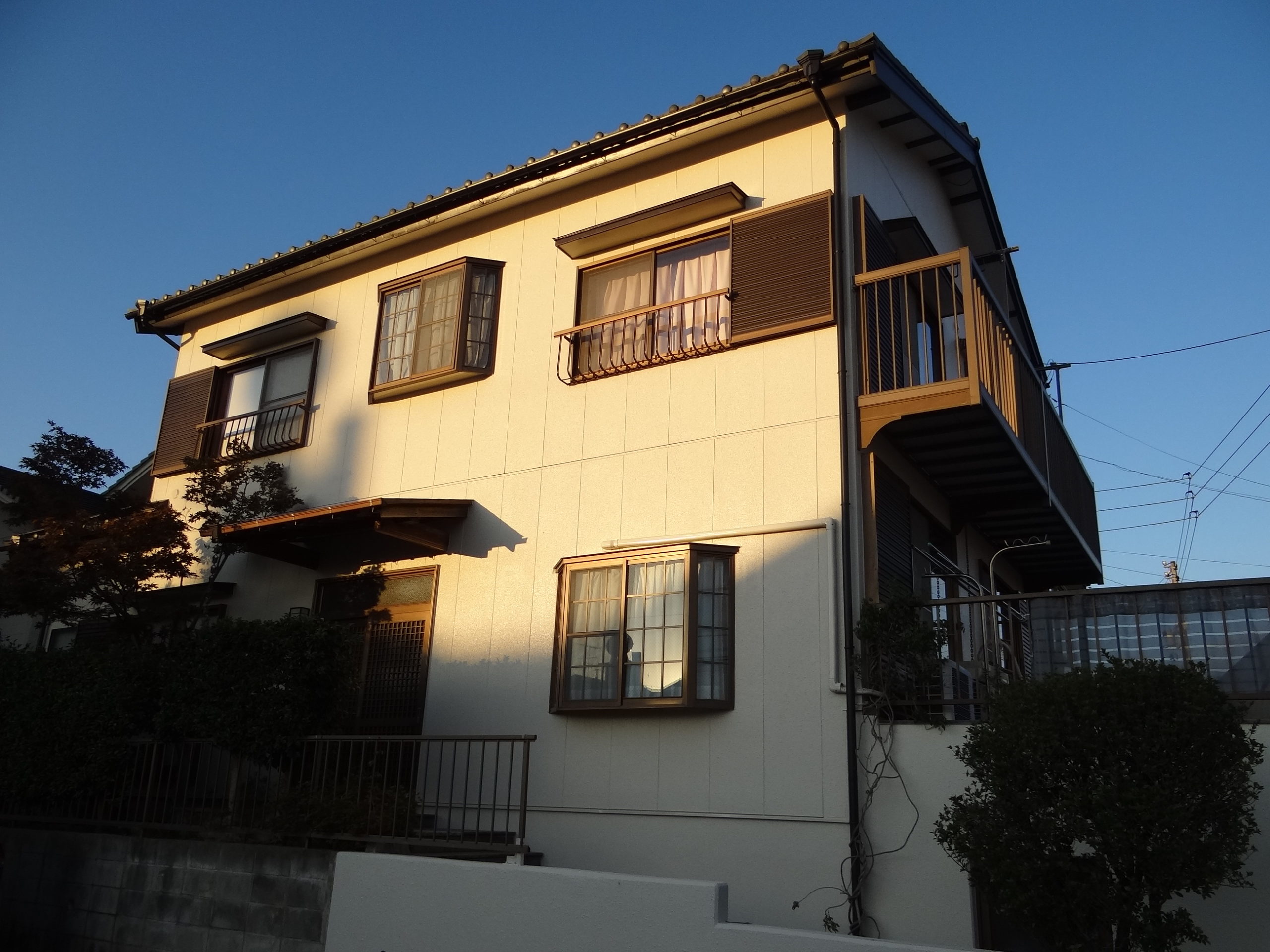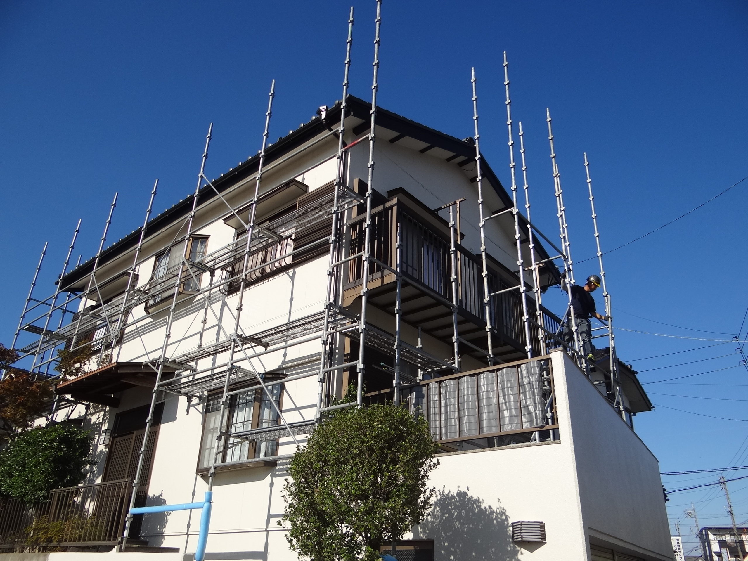 今日の外壁塗装工事は各部のチェックと窓ガラスの清掃を済ませ、仮設足場の解体を行いました。その後は、現場周囲の清掃。これで全ての外壁塗装工事の完了です。御施主様、大変お世話になりました。